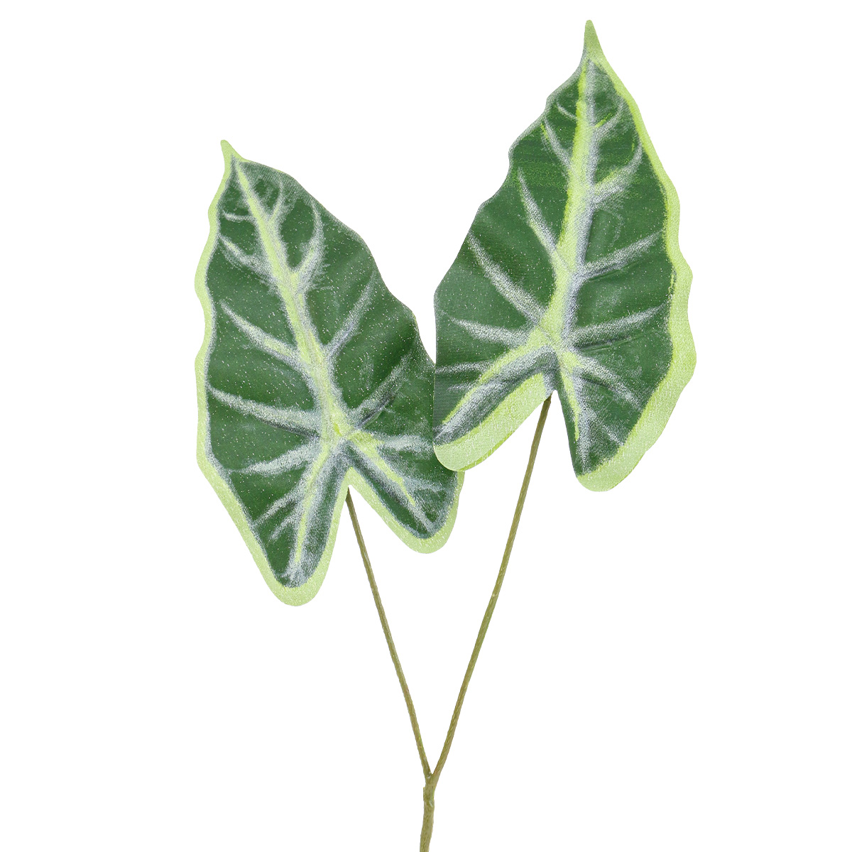 Et av disse utsmykkede pilbladene er festet til hvert av de to kunstige skuddene til den grønne kunstige planten. En bred, lysegrønn kant sporer formen på bladene. Bladårene er også utformet i samme tone, mens dyp mørkegrønn representerer vevet. Bladet er laget av tynn plast, som føles grov og myk. Den sitter på de solide plastbladårene på baksiden.