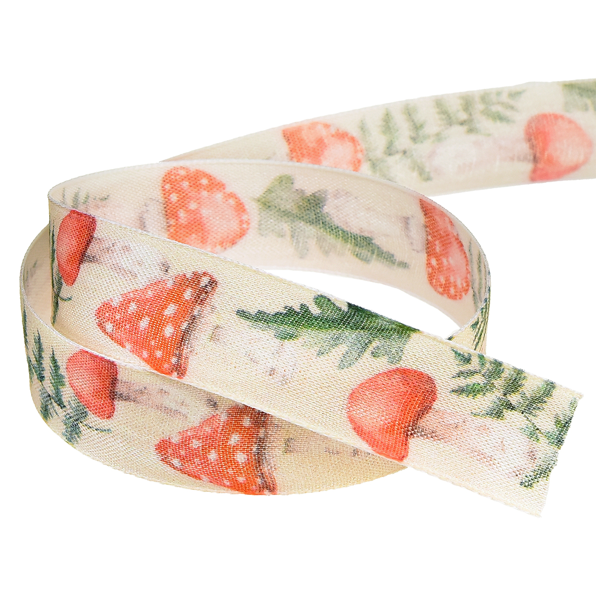 Den kremfargede overflaten med en liten skimmer og de kjærlig trykte paddehattene gjør båndet vårt til det perfekte tilbehøret for sesongmessige dekorasjoner og DIY-prosjekter. Takket være den formstabile kanten og den høykvalitets utførelse, kan båndet brukes på en rekke måter - enten det er til å knytte blomsteroppsatser, pynte juletreet eller som stilig borddekorasjon. Fullfør din høstlige landstedsstil med dette smakfulle dekorative båndet, som kan kombineres med rustikke elementer og naturlige materialer.