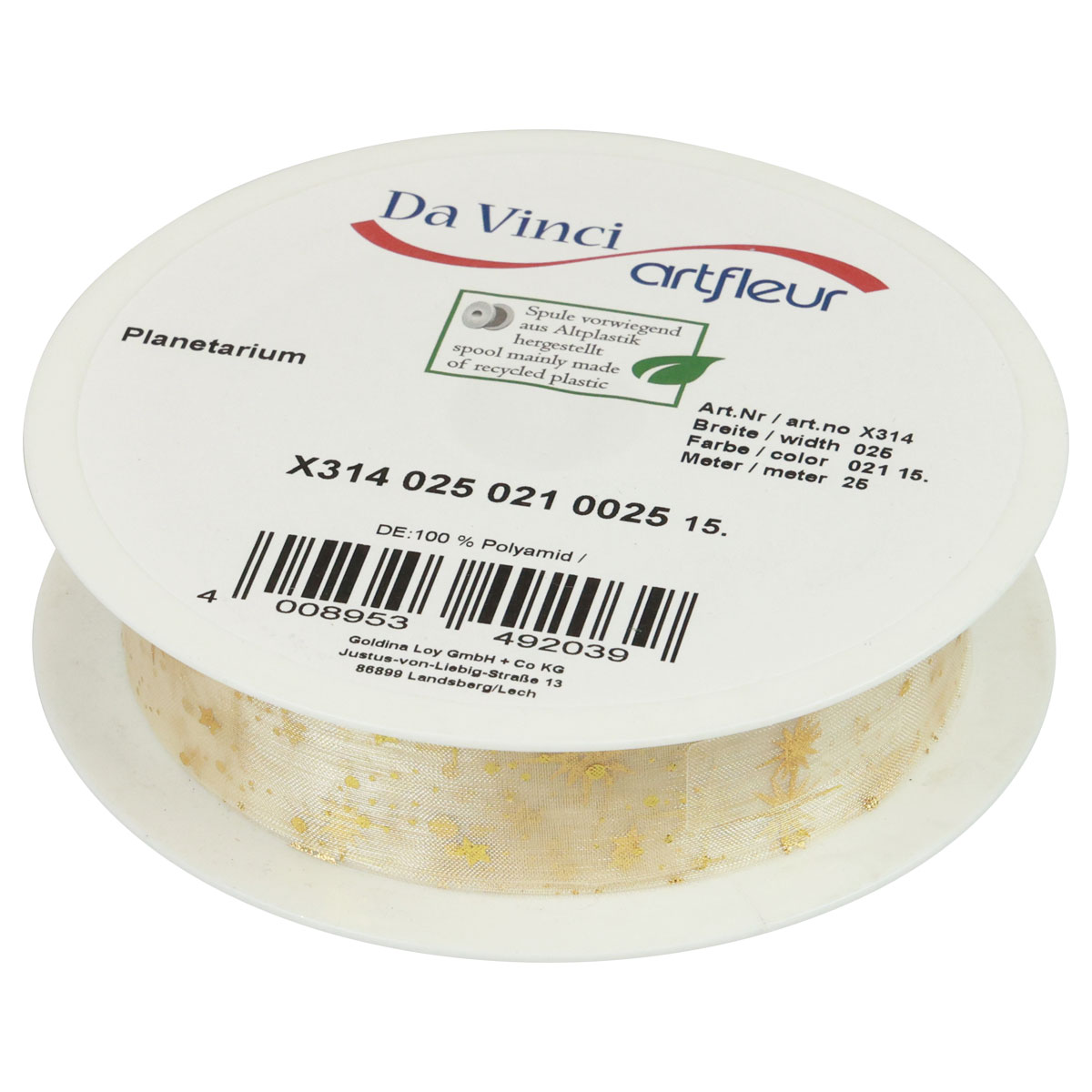 Dekorasjonsbåndet til jul laget av organza i hvitt med gyldne stjerner kommer som et bånd med en bredde på ca 25 millimeter rullet opp på en plastsnelle. Den totale lengden på organzabåndet er rundt 25 meter.