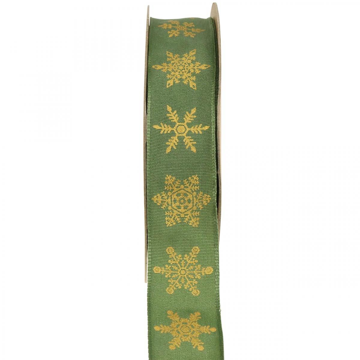 Bånd julesnøfnugg grønn, gul 25mm 15m
