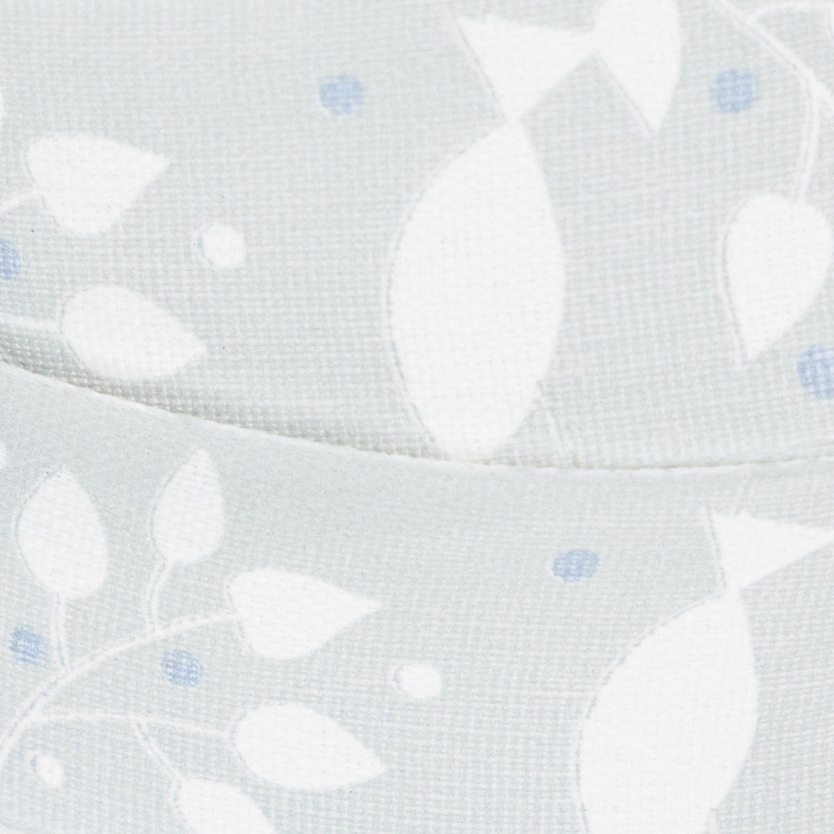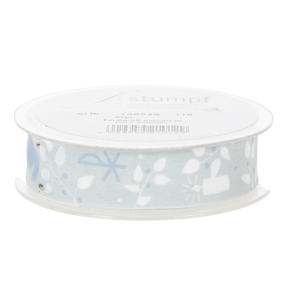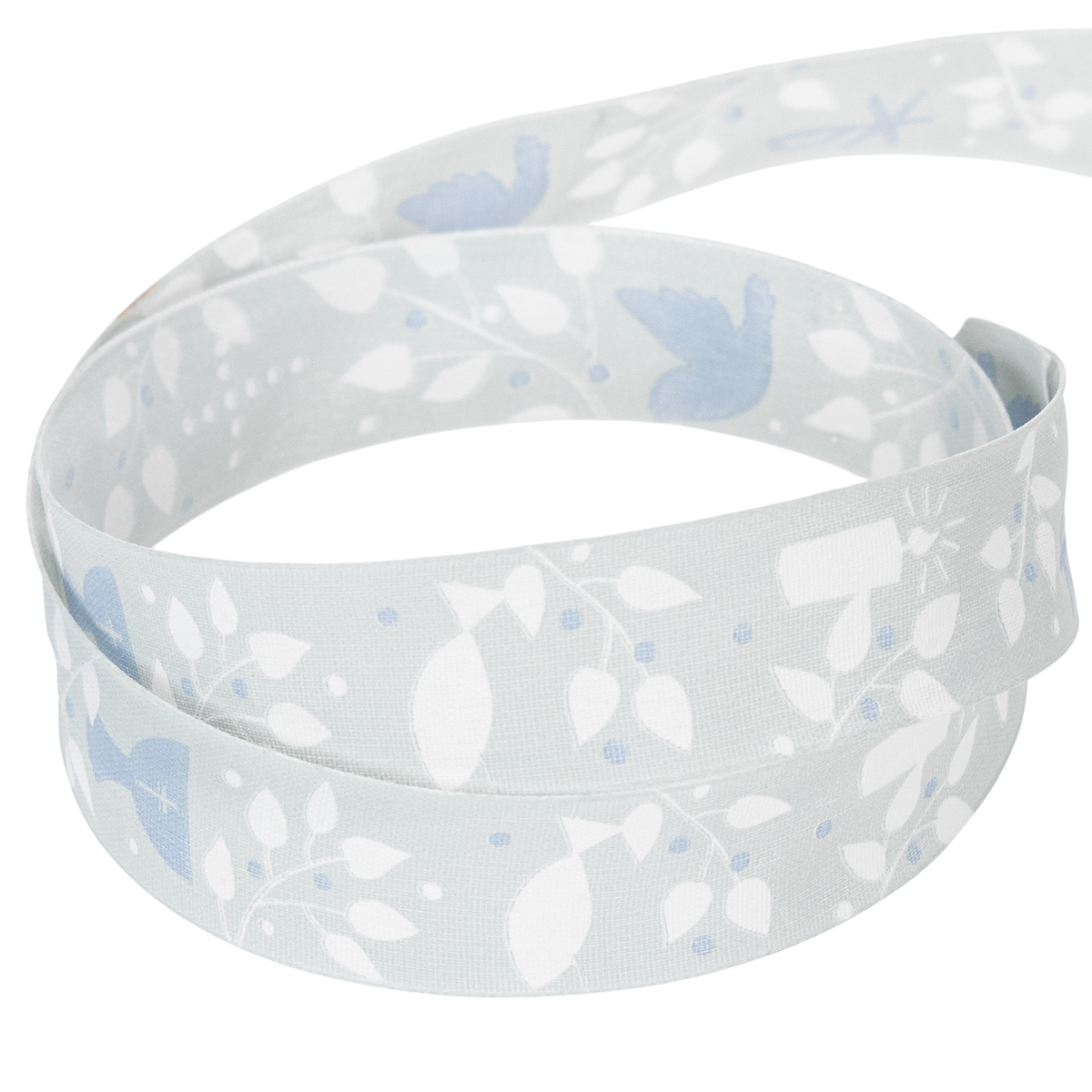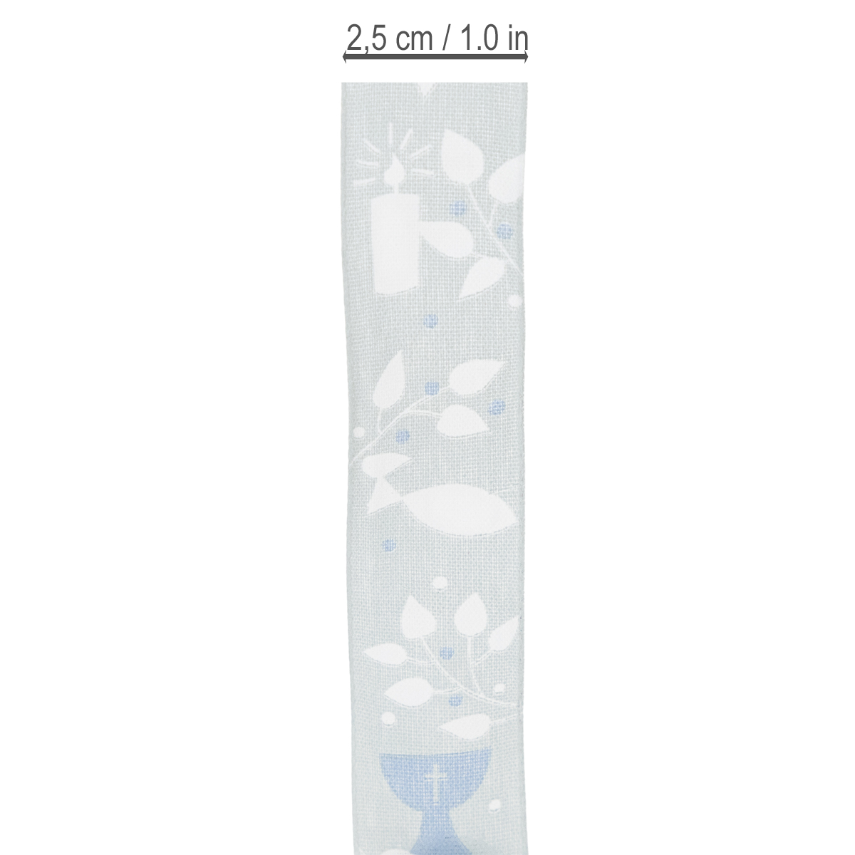 Det lyseblå stoffbåndet er trykket med kristne symboler i hvitt og mørkeblått, som refererer til den religiøse anledningen og har et fantastisk tidløst design. Siden motivene er omgitt av ranker av blader, kan båndet enkelt innlemmes i blomsterdekorasjoner for nattverd. En kantkant gir det dekorative båndet stabilitet.