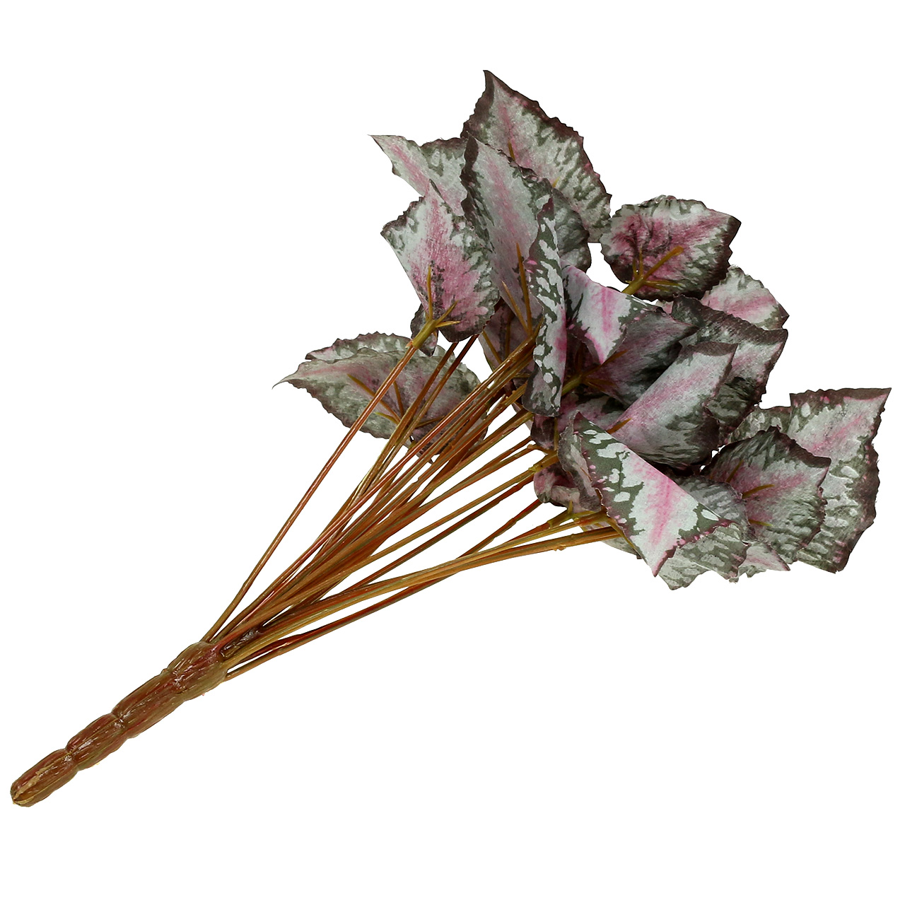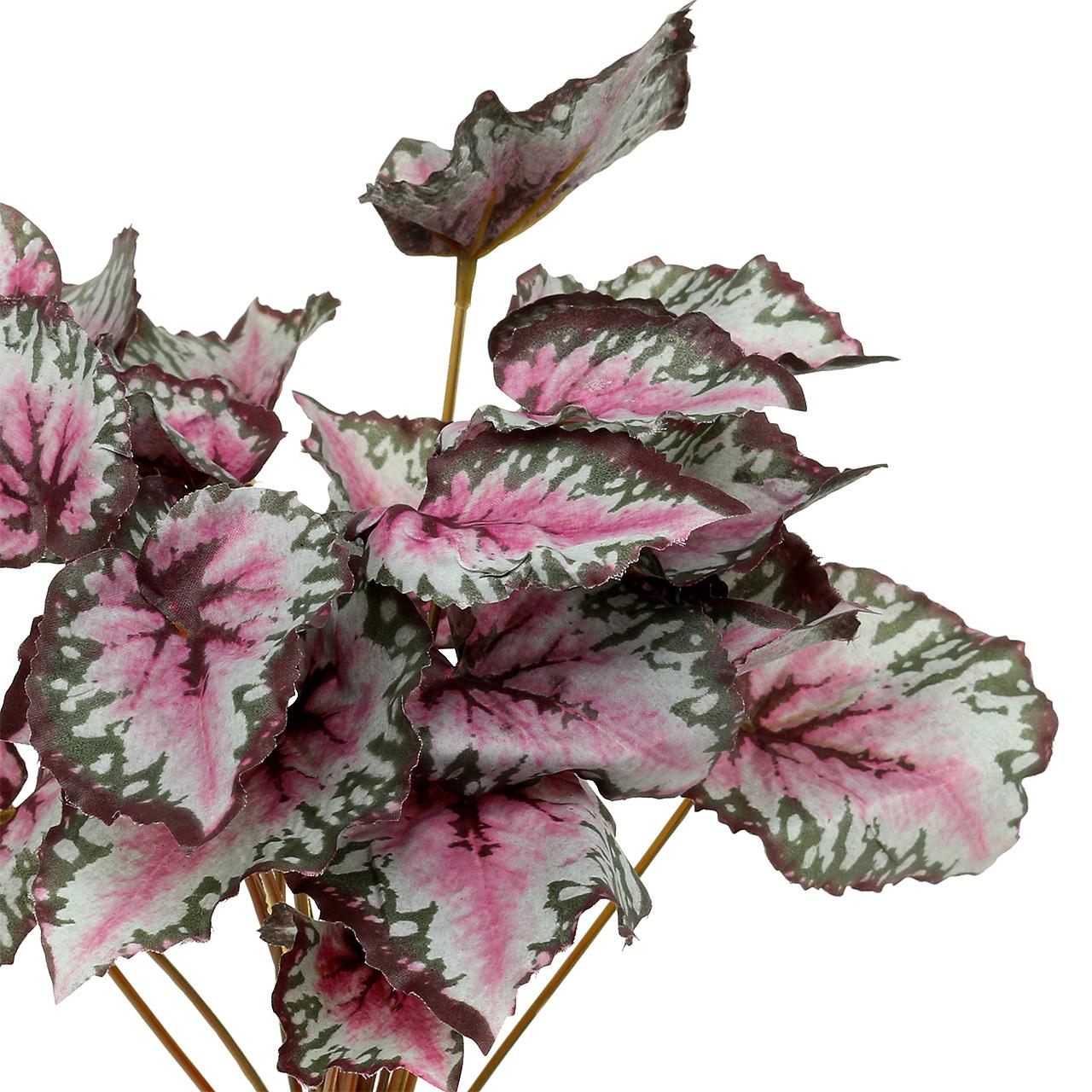 Den kunstige begonia busken i fargene grønn og lilla består av plast og silke stoff og har en total lengde på ca 34 centimeter, med stilken ca 8 centimeter lang. På den dekorative planten finner du rundt 24 blader inkludert stengler med en trådkjerne.