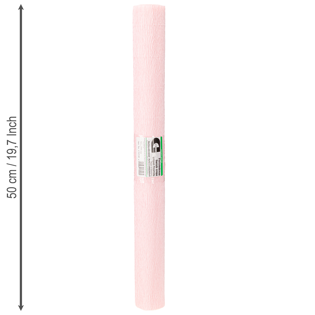 Blomsterhandler crepe papir i rosa leveres som en rull, som er omtrent 50 x 250 centimeter i størrelse. Grammatikken er rundt 128 gram per kvadratmeter og vekten er rundt 160 gram per rull.