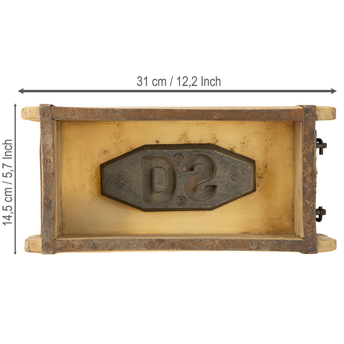 Det oksiderte metallet med lett rust understreker vintagesjarmen til den lille treboksen ytterligere. Nybehandlet og oppfrisket, den gamle mursteinsformen er nå en flott tre- og metalldekor med et nytt formål.