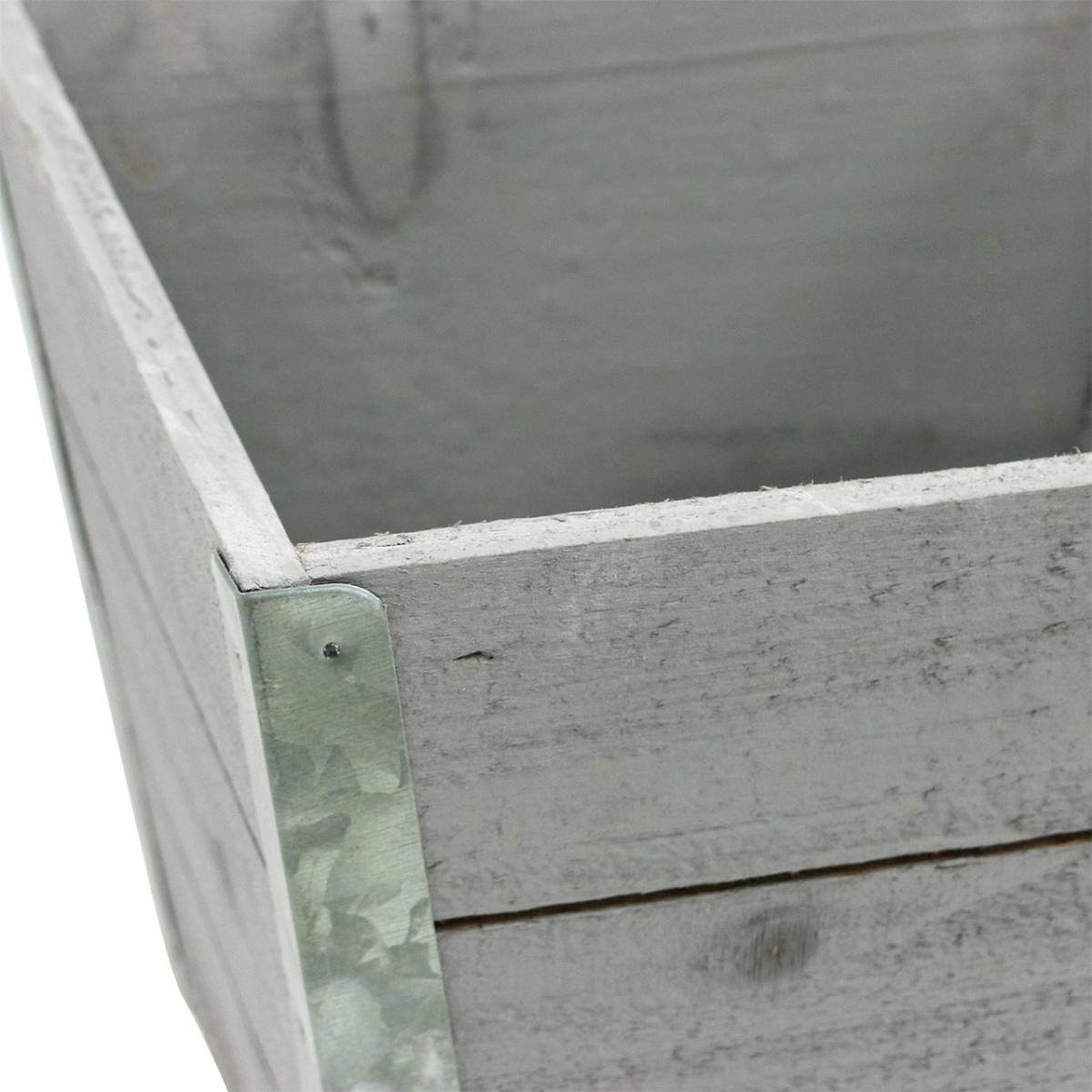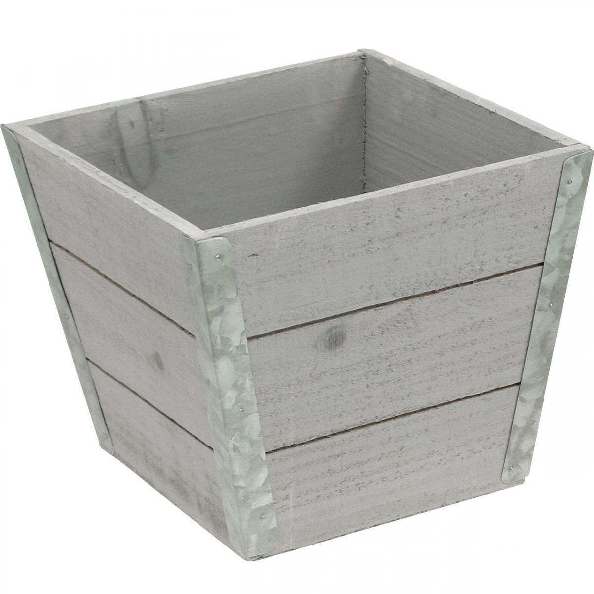 Plantekassen har en trapesformet form som smalner av mot bunnen. De fire kantene er forsterket med metallplater og fungerer også som dekorasjon. Med den grå malingen kun veldig lett påført, ser trepotten veldig vintage ut.
