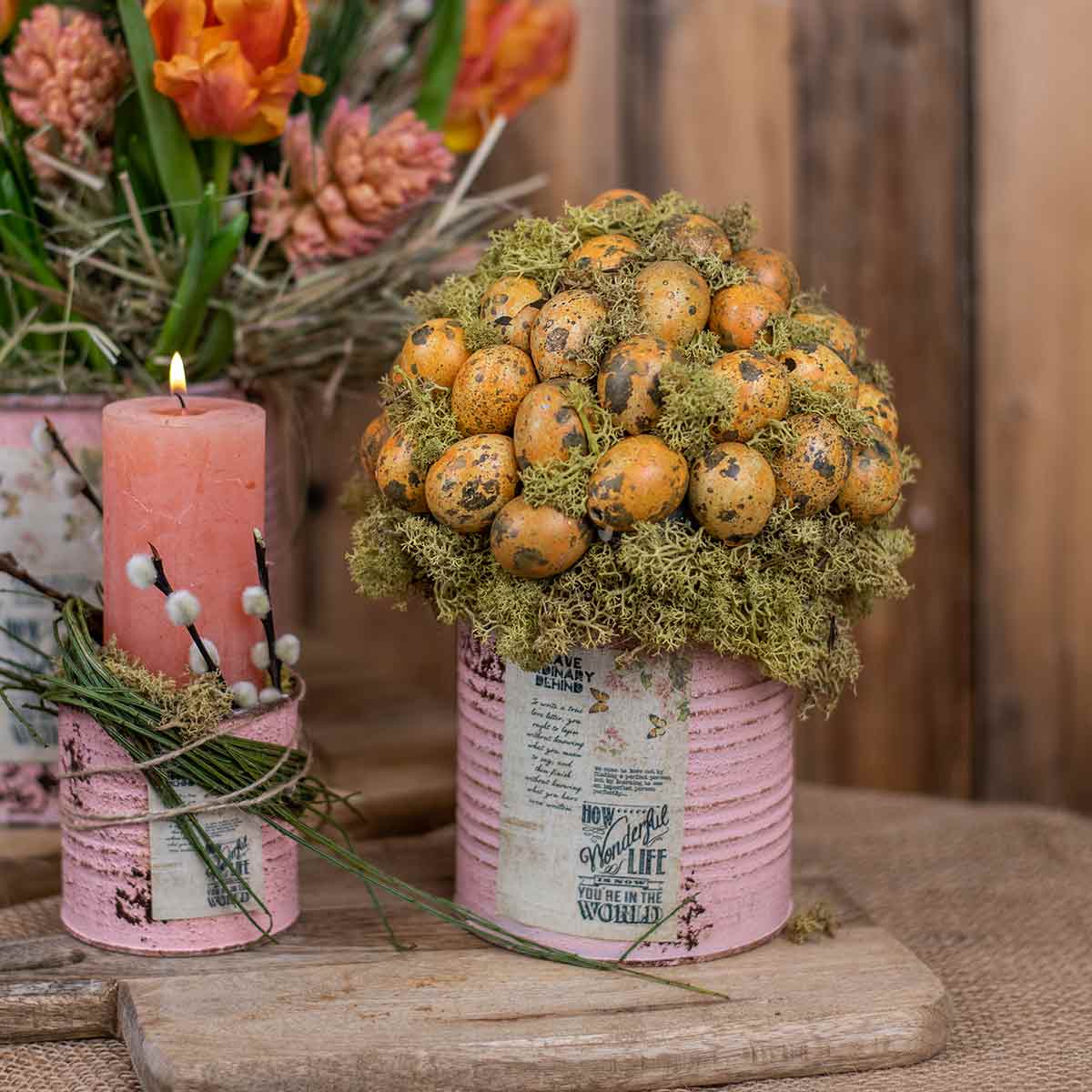 Blomsterpotten laget av en dekorativ boks i pastellfargen laks er minst like stemningsfull som en ekte vintage blikkboks. Sommerdekorasjonen av metall har imidlertid den avgjørende fordelen at det ikke er skarpe kanter her. På denne måten kan du plante blikkboksen uten fare for skade. En rusten brun nyanse dukker opp under den børstede pastellfargen på rillene på tinn. I tillegg understreker malte rustflekker og en nostalgisk etikett den shabby chicen til retroboksen. Interiøret i den dekorative potten holdes veldig enkelt i sølv.
