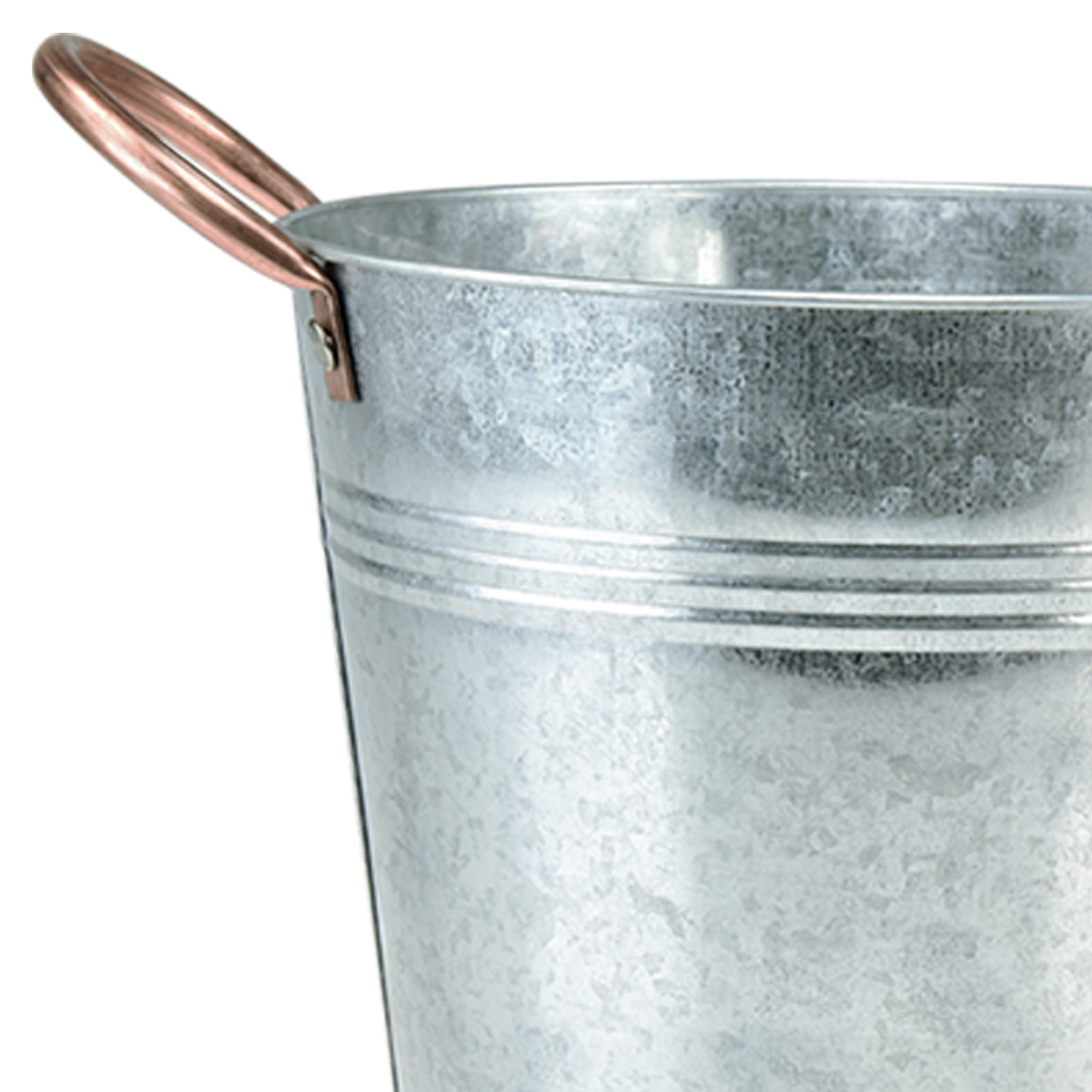 En fengslende kontrast av forskjellige metaller skapes av de kobberfargede håndtakene på denne metallbøtten. Den galvaniserte, skinnende sølvoverflaten gir plantekassen et subtilt vintage-utseende. Før planting er det lurt å fore metallbeholderen med folie for å forhindre rust og korrosjon.