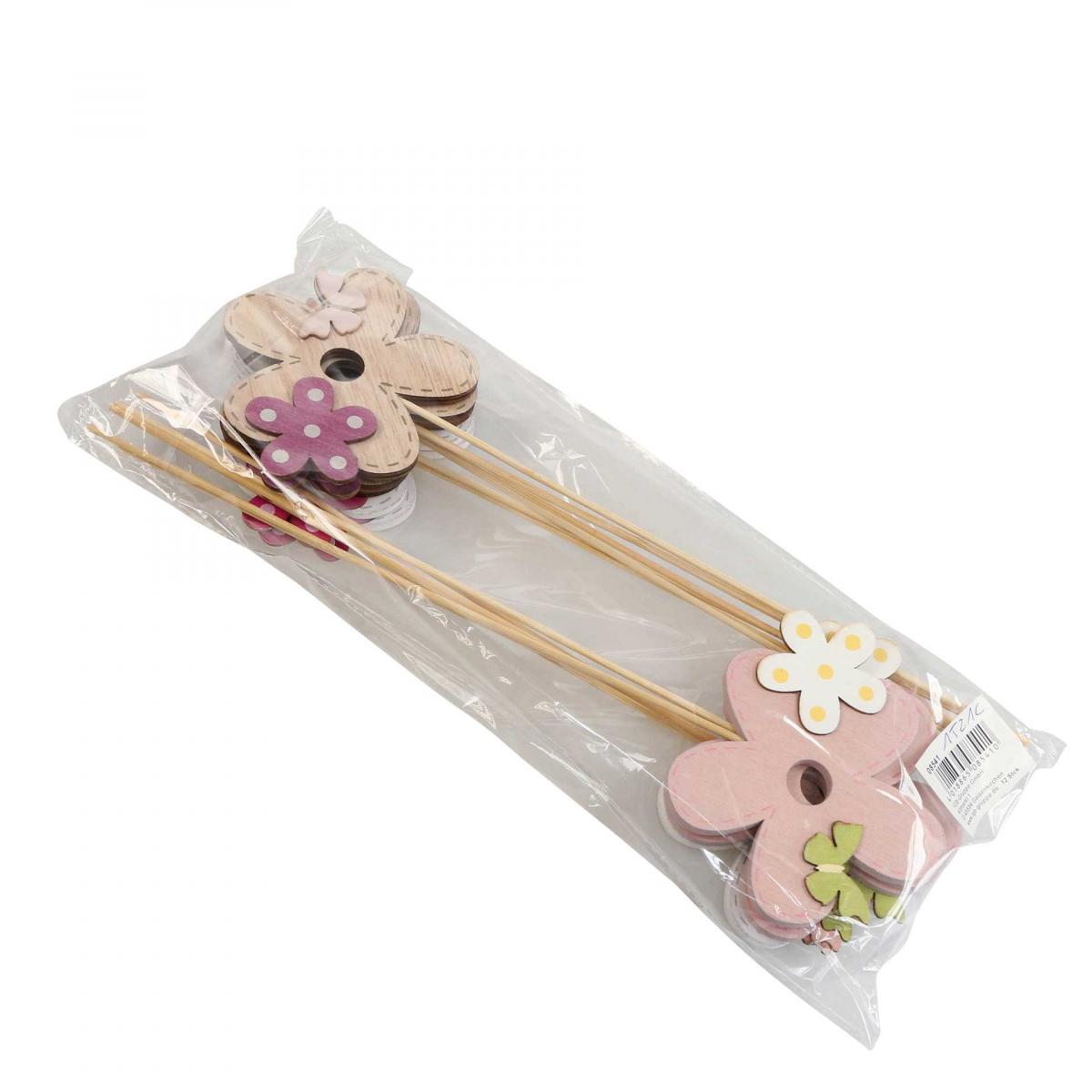 Du får totalt tolv blomsterplugger i forskjellige farger. Dette er fire treblomster i rosa med en hvit blomst og en grønn sommerfugl, samt fire naturfargede blomster med en lilla blomst og en rosa sommerfugl, og fire hvite blomster med en mørk rosa blomst og en rosa sommerfugl.