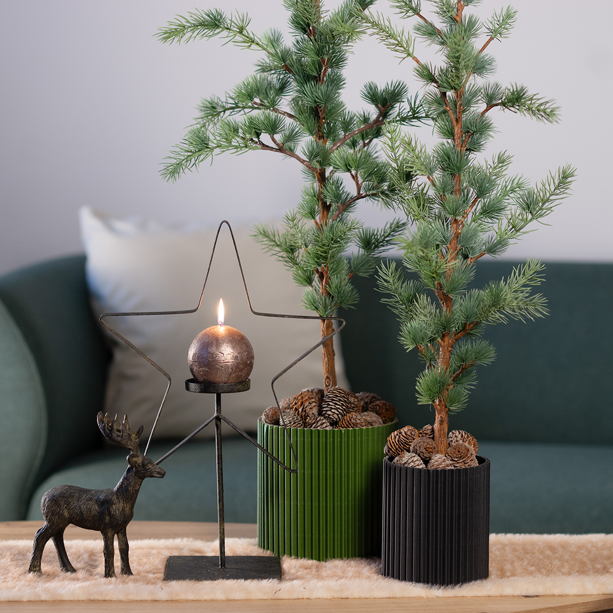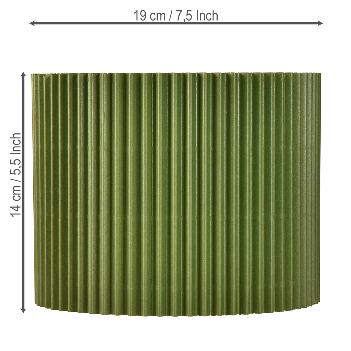 Denne elegante, mørkegrønne papirpotten gir et dekorativt preg til ethvert rom. Med en diameter på omtrent 19 cm og en høyde på omtrent 14 cm er denne blomsterpotten ideell for mellomstore planteoppsatser. Det moderne designet med riflet ytterlag gir den en interessant tekstur. Dette gjør potten ideell for stuer, kontorer eller som en kreativ gave. Vær oppmerksom på at potten bør fores med folie før bruk med levende planter for å beskytte den mot fuktighet. Blomsterpotten er perfekt for dekorative planteoppsatser hjemme eller til blomsterdekorasjoner og butikkvinduer.