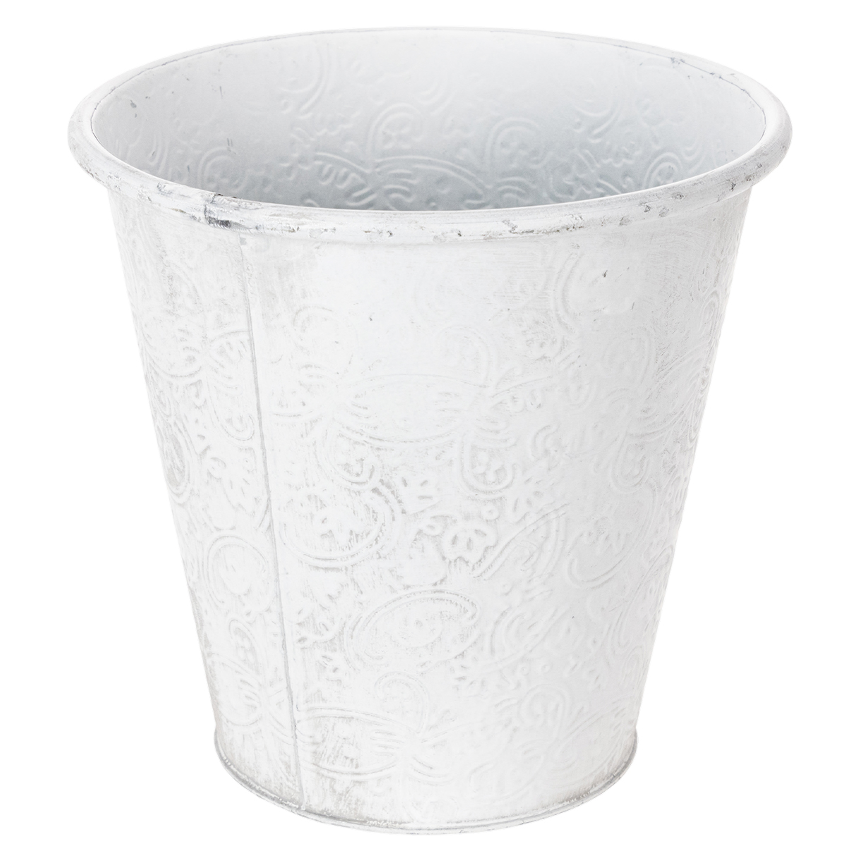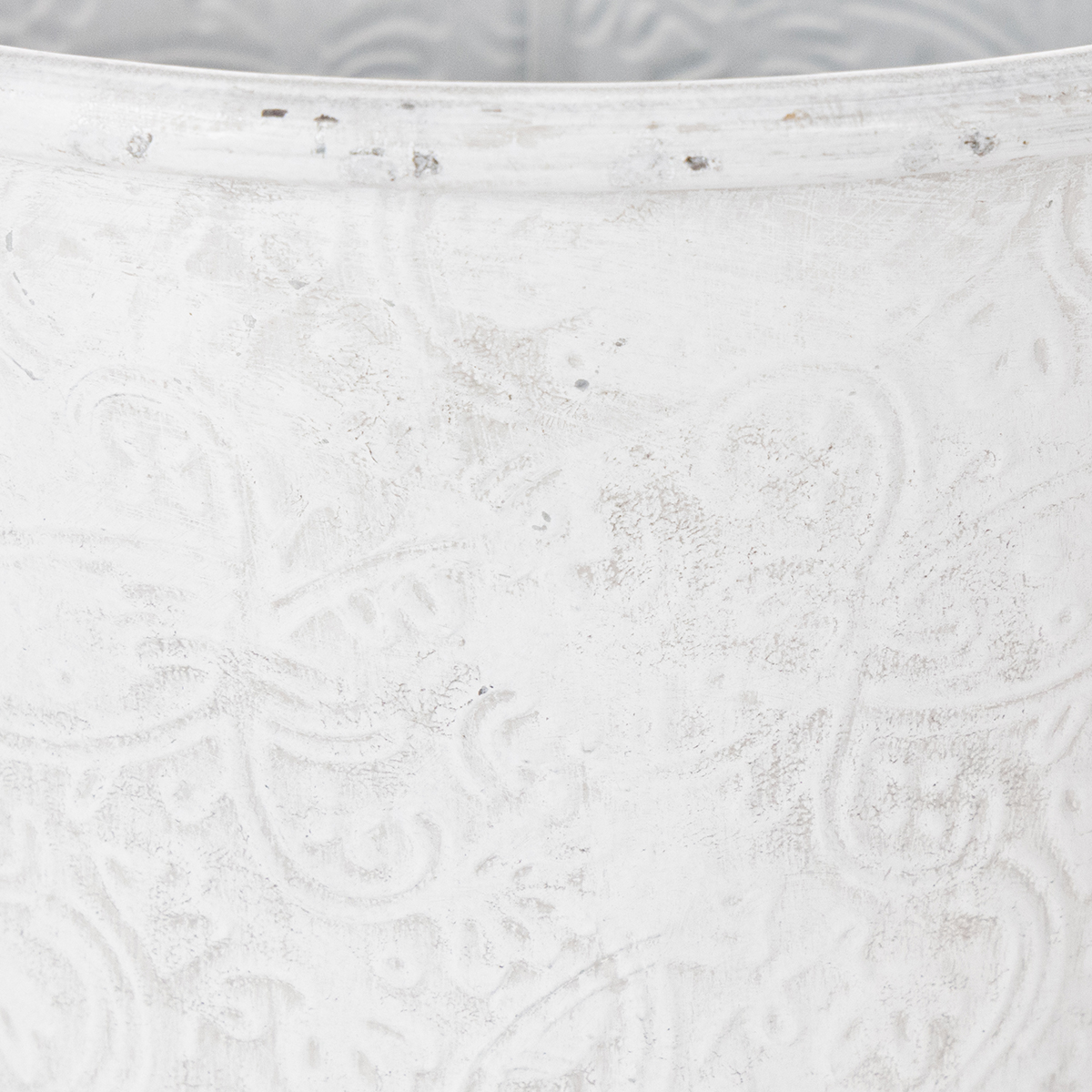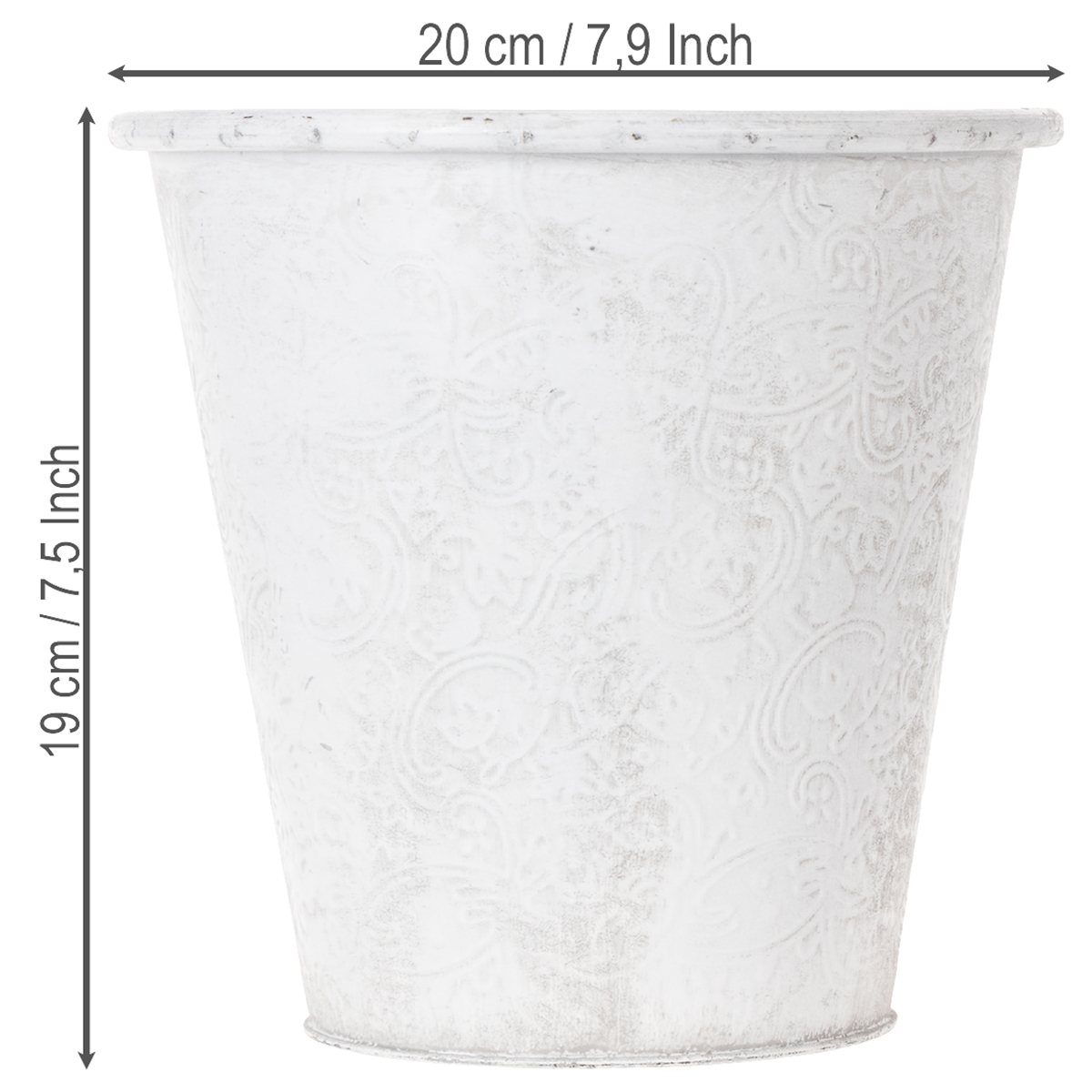 Den eventyrlignende cachepotten er dekorert med ornamenter: Metalldekorasjonen er preget med blomsterblomster rundt omkring. Med sitt romantiske utseende og den hvite vasken i trendy shabby chic, passer metallkaret også fantastisk som borddekorasjon i vintagestil til en blomsterdekorasjon til et bryllup!