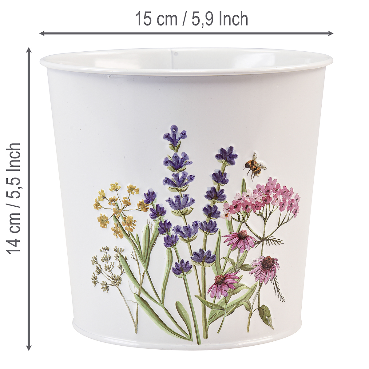 Denne vakre metallblomsterpotten er perfekt som plantekrukke for vår- eller sommerdekorasjoner! Den enkle plantekassen i hvitt metall er dekorert på den ene siden med et preget motiv av ville urter med en bie, farget i naturlige farger.