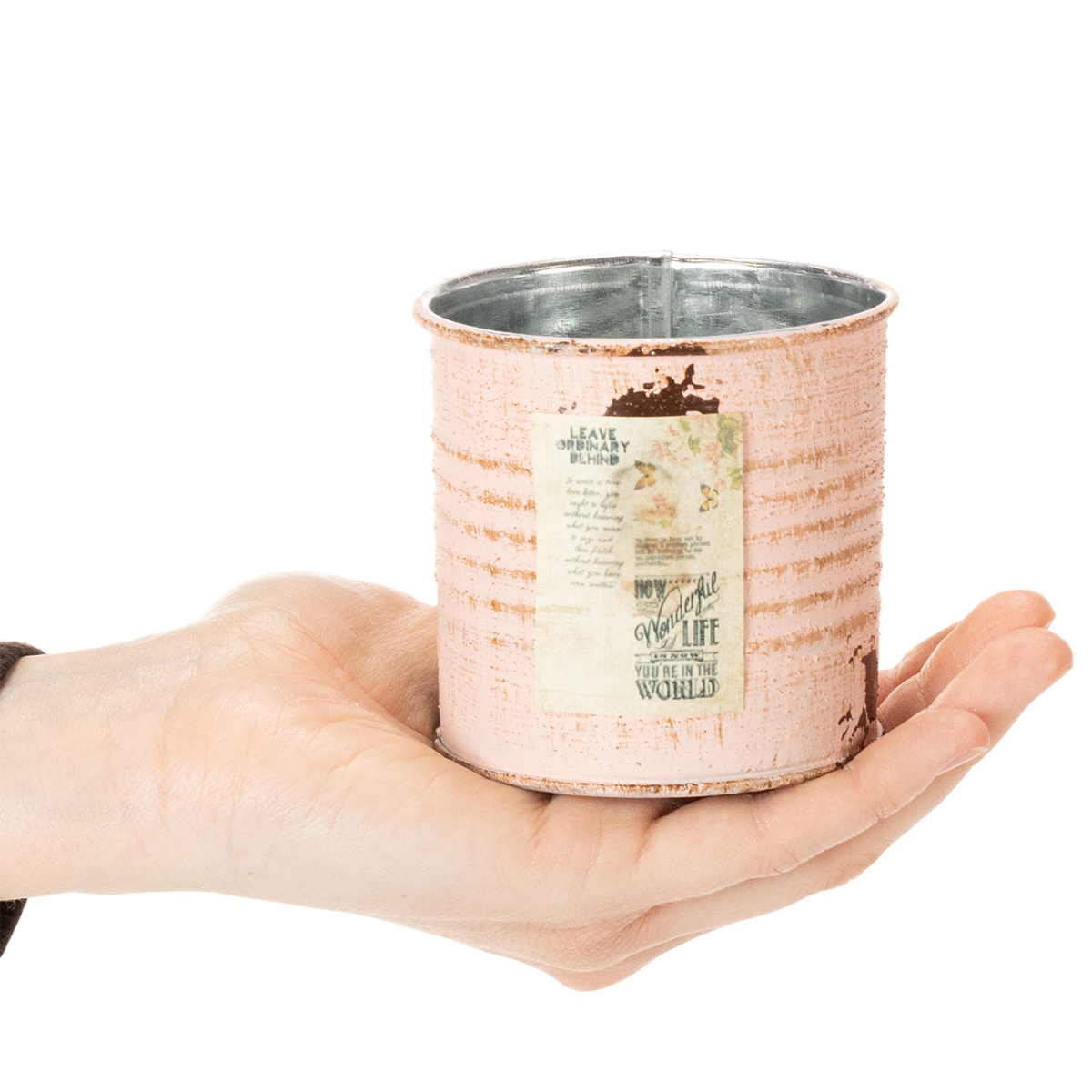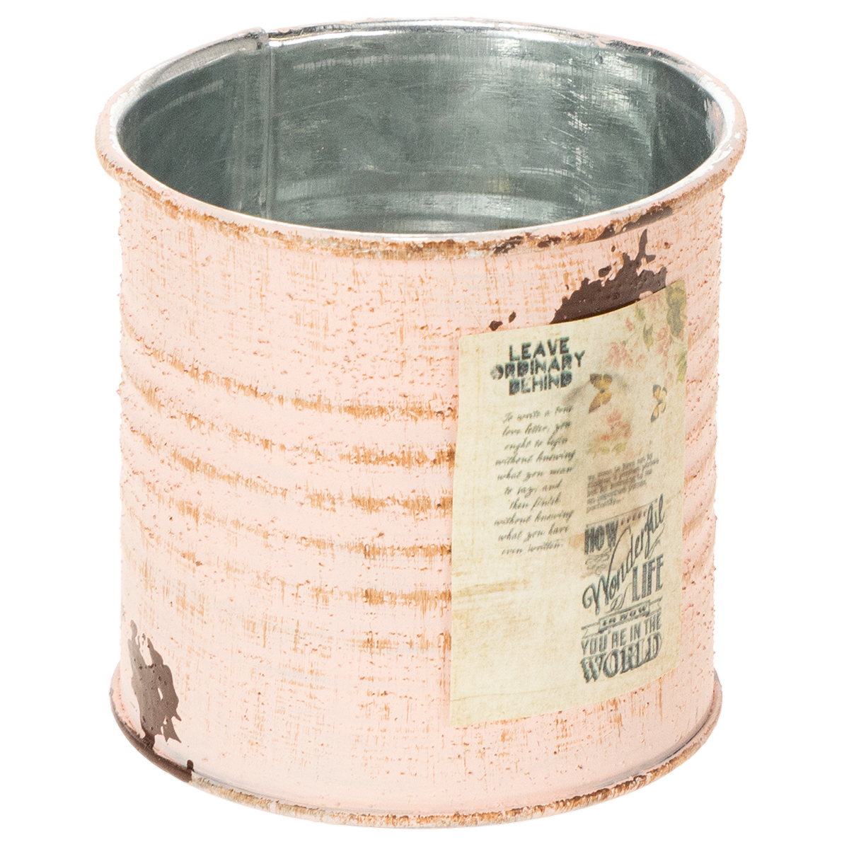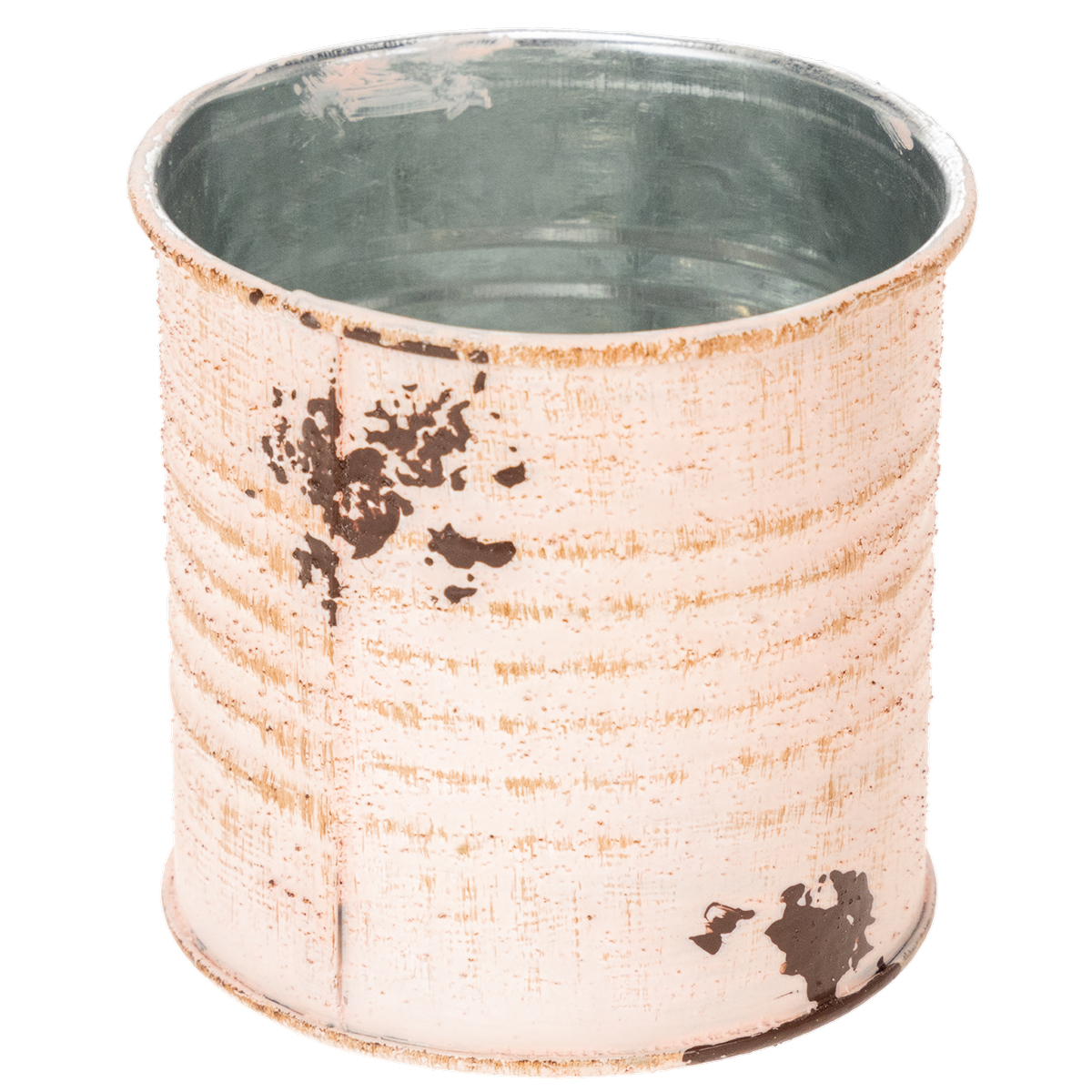 Som blomsterpotte er pynteboksen i laksefarget variant garantert et blikkfang! Den lille blikkboksen av metall er sprayet sølv på innsiden og tofarget på utsiden med vintage maling. Små detaljer som en nostalgisk etikett og malte rustflekker gjør metallgryten til en gammeldags dekorativ gjenstand.