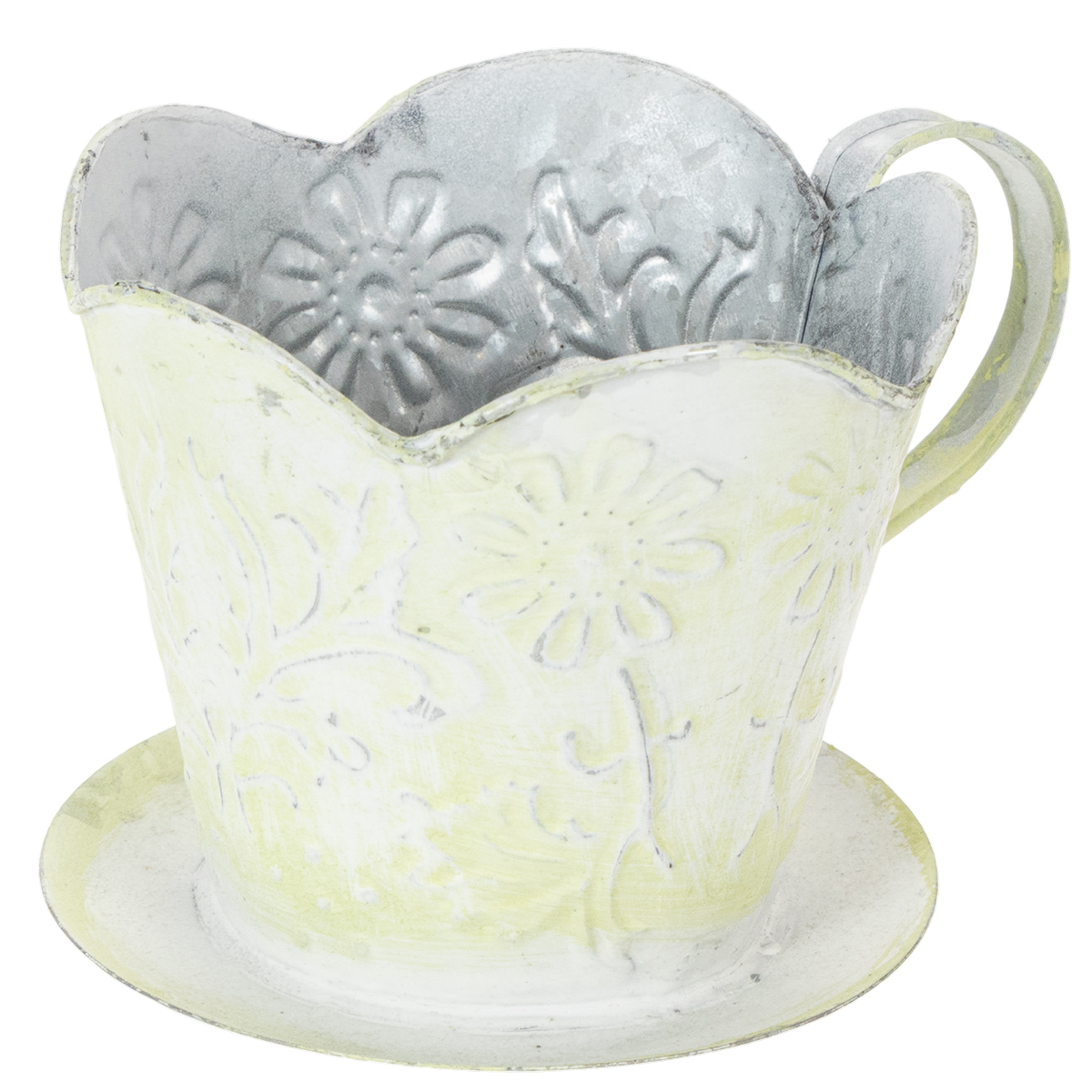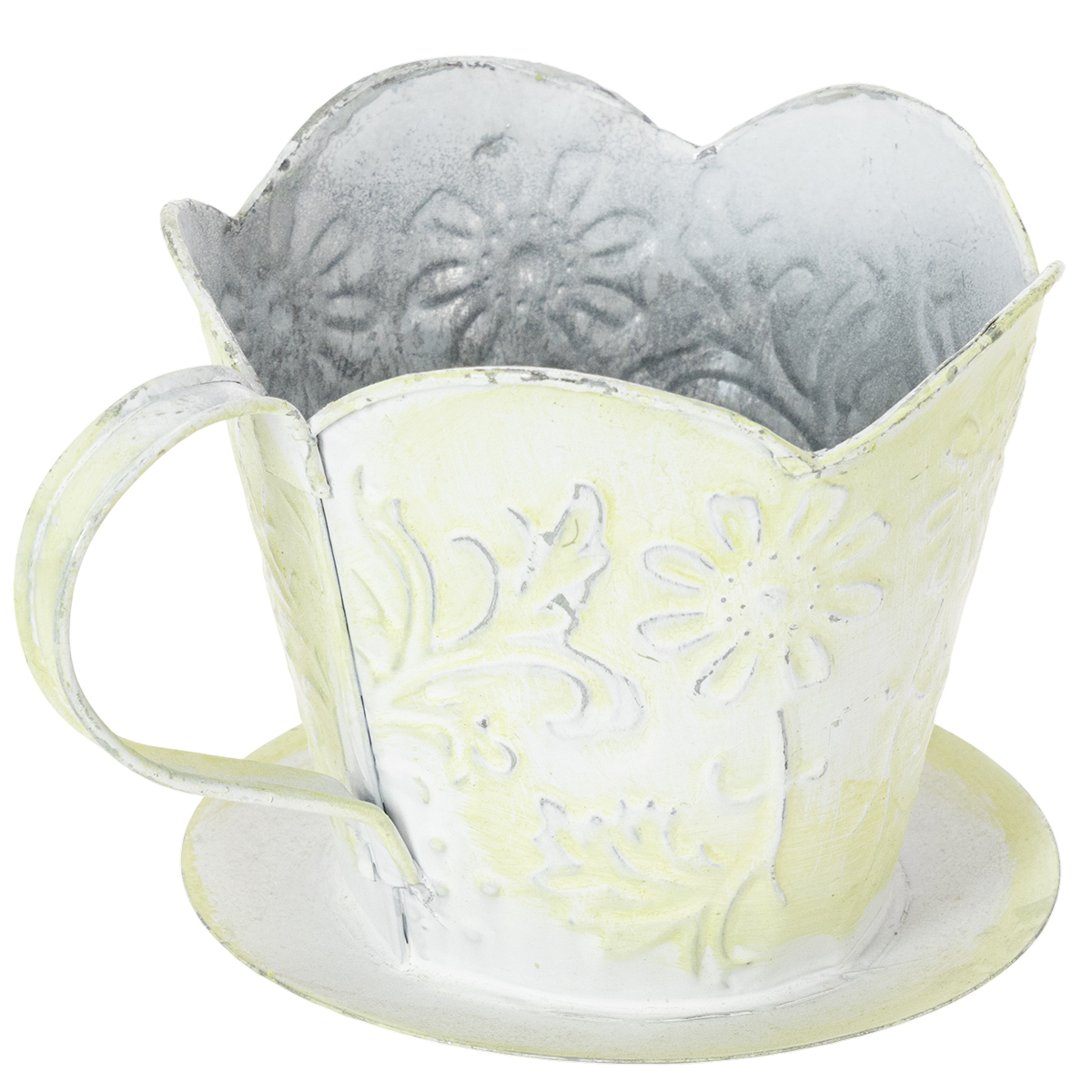 Denne originale plantekassen i stil med en dekorativ metallkaffefilterholder er perfekt for enhver borddekorasjon! Metallkoppen for planting har en blomsterpreget blomsterdekor laget av blomstrende planter og ranker. I tillegg er den pene koppen med tallerken korrugert som kronblad på toppen og flekkete grønn og hvit i trendy shabby chic, slik at sølvbakgrunnen delvis skinner gjennom.