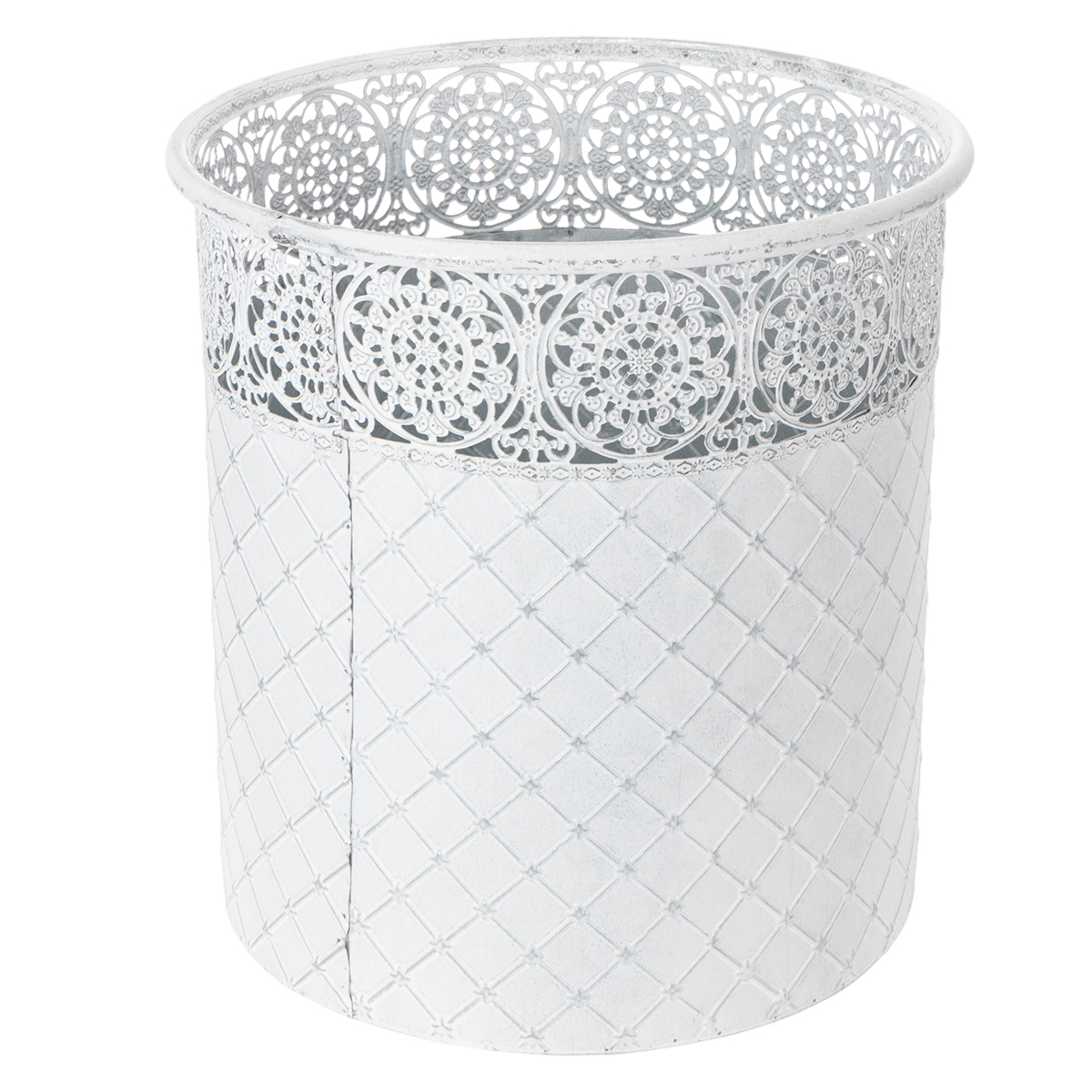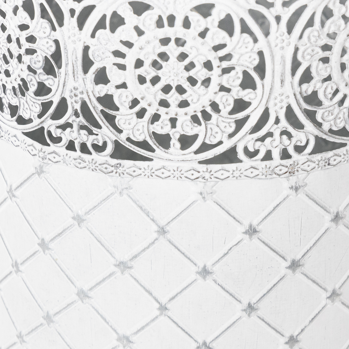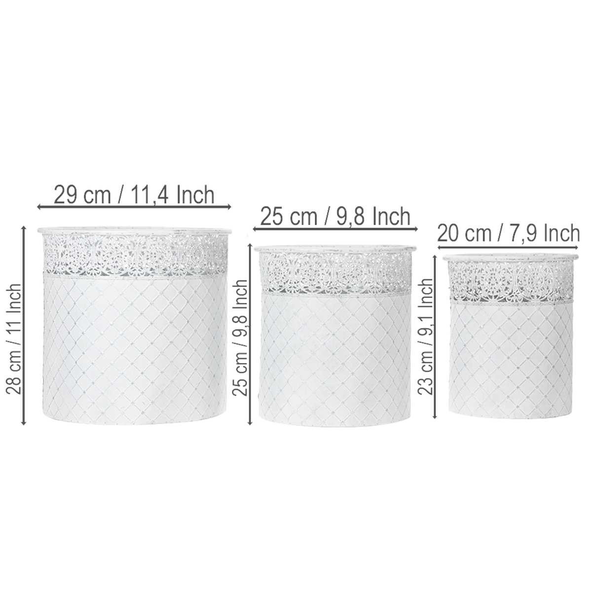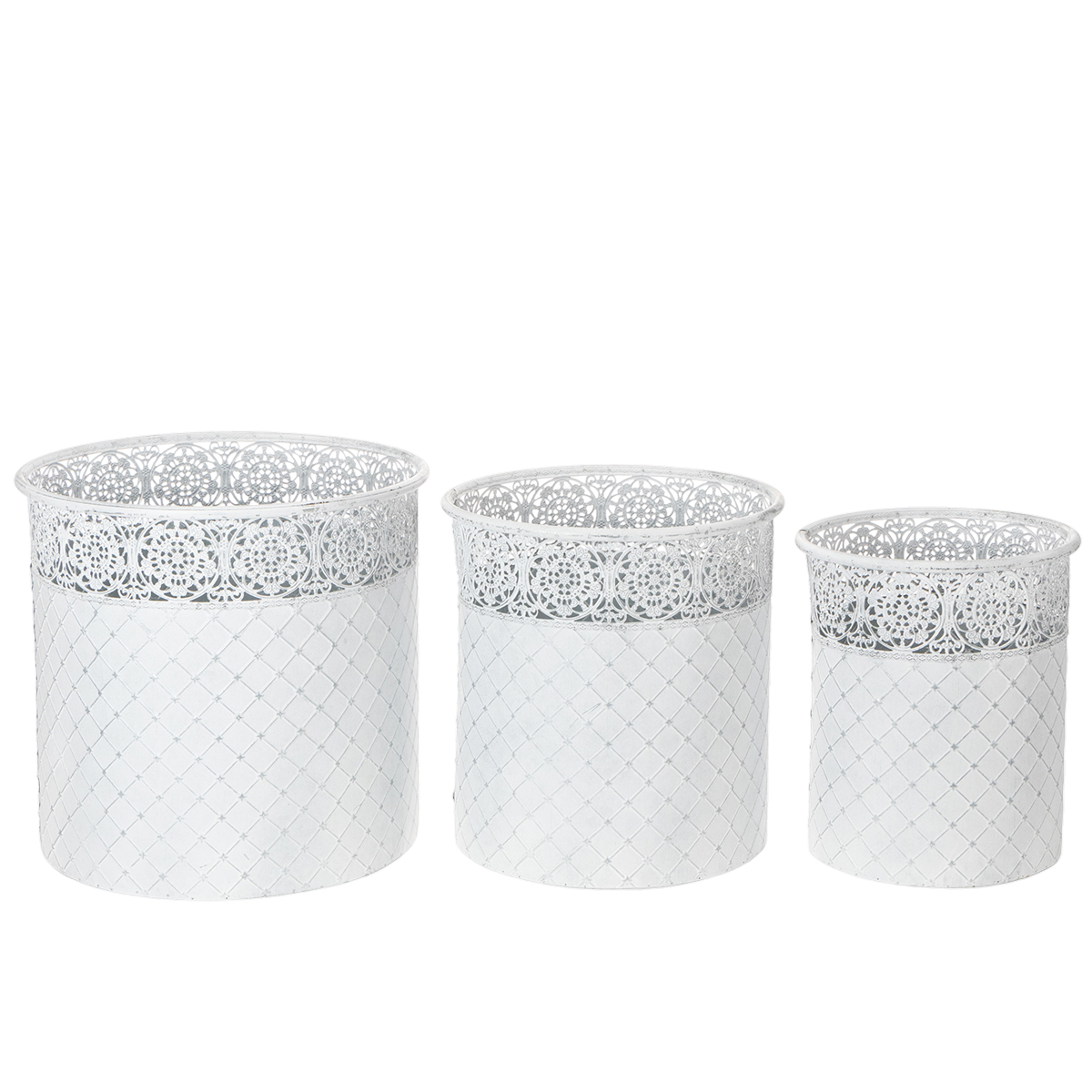Blomsterpotte med blondemønster, metallbeholder, dekorativ bøtte, hvit, sølv, shabby chic, H28/25,5/23,5 cm, Ø29,5/25,5/20 cm, sett med 3