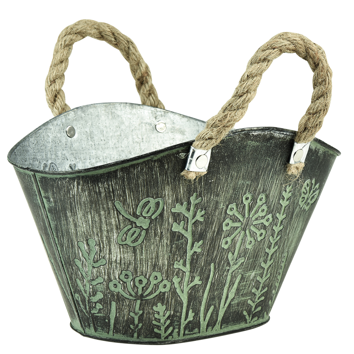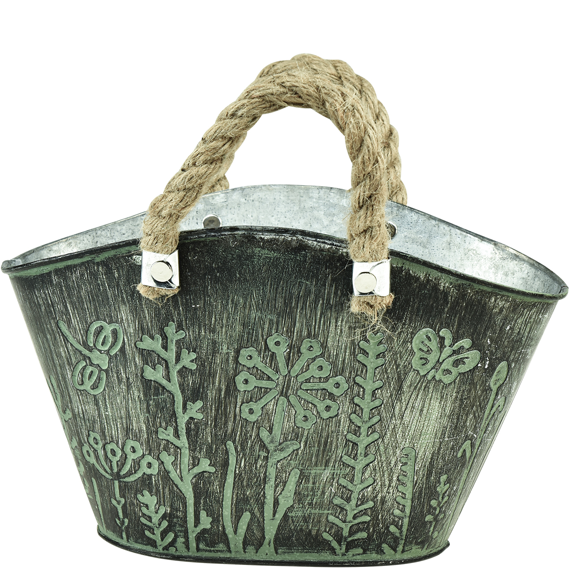 Plantekassen har form som en vevd handlepose og ser veldig avslappet ut. Utvendig er metallkrukken behandlet i grønt og mørkegrå og utseendet preges av en stilisert villblomsteng. De flettede håndtakene laget av naturfiber gjør resten for å gjøre den ovale blomsterpotten til et helt spesielt stykke.