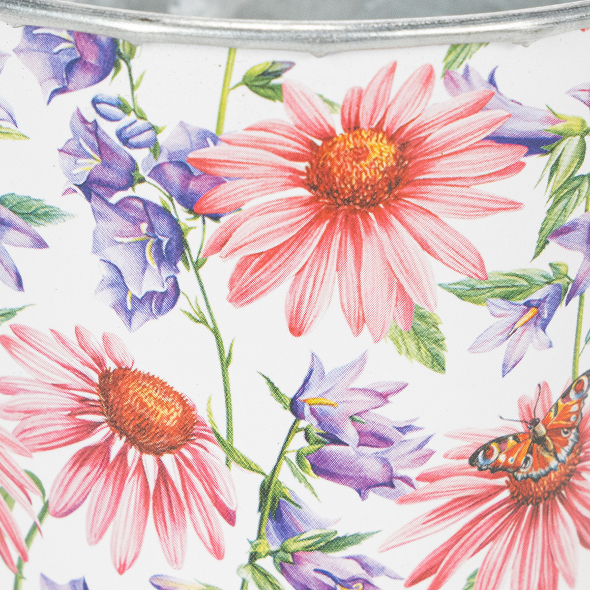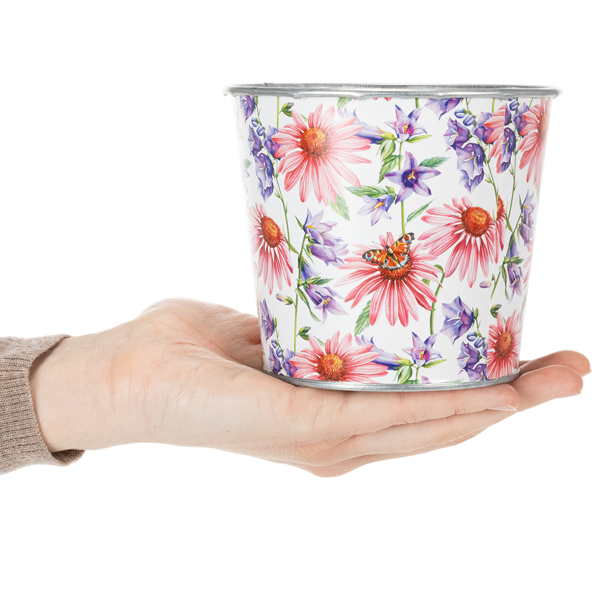 Alle blomstene blomstrer i denne nydelige nostalgiske blomsterpotten til vårpynt! Plantekassen i metall viser et vårfriskt motiv med solhatt og blåklokke.