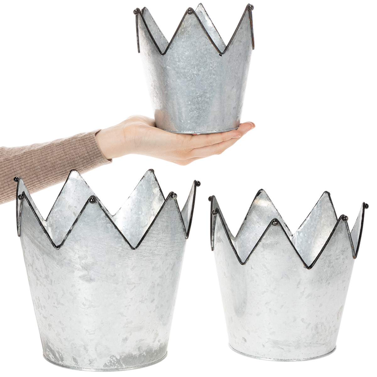 Forfin vinduskarmene og kommodene dine med disse tre kroneformede plantekassene! De dekorative kronene er laget av metall, nærmere bestemt sink.