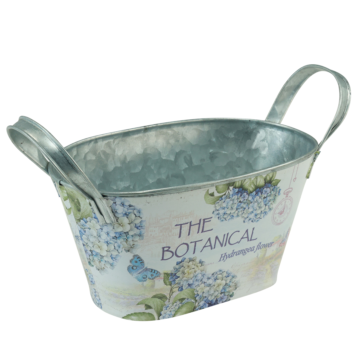 Den ovale blomsterskålen med håndtak er en sjarmerende måte å lyse opp sommeren med stilige metalldekorasjoner! Trykket med blå hortensiaer formidler følelsen av varme dager i hagen.