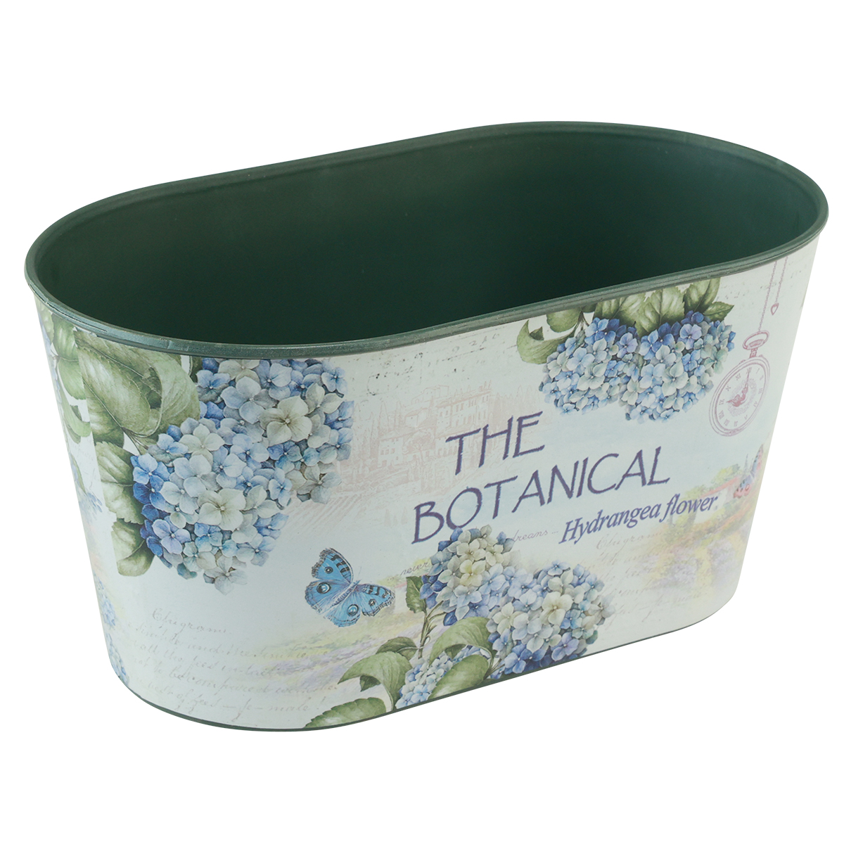 Det nostalgiske motivet med masse blå hortensiaer er trykt på en høykvalitets film som dekker utsiden av den grønne plantepotten perfekt bortsett fra kanten. Den ovale skålen kjennetegnes ved at den er laget av robust plast.
