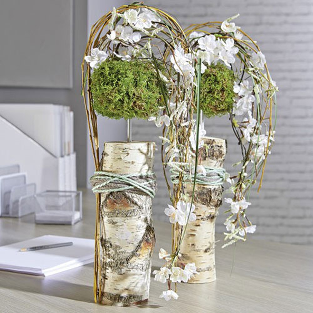 Med små, utsmykkede skuffer eller dekorative plater i hvitt er det flotte dekorative alternativer. Med skumroser, perler og organzabånd kan du lage en fantastisk borddekorasjon for eksempel til et bryllup. For dette kan du også stable flere sylindere med varmt eller kaldt lim oppå hverandre. Du kan feste plastark på sidene med nåler eller patentklips. Fyll deretter den øvre delen med blomster. Legg til et fint bånd - den søteste borddekorasjonen er klar. Den sylindriske plug-in-blandingen kan også tilberedes med barkbånd, bast og kunstige bær. Julebånd, kanelstenger og kunstige kristtorngrener passer også godt sammen med hatten mose. Dette skaper et flott blikkfang for utstillingsvinduer, hotellresepsjon eller venteområder med bare noen få enkle trinn. Med settet kan du lage flere av de søte blikkfangene.