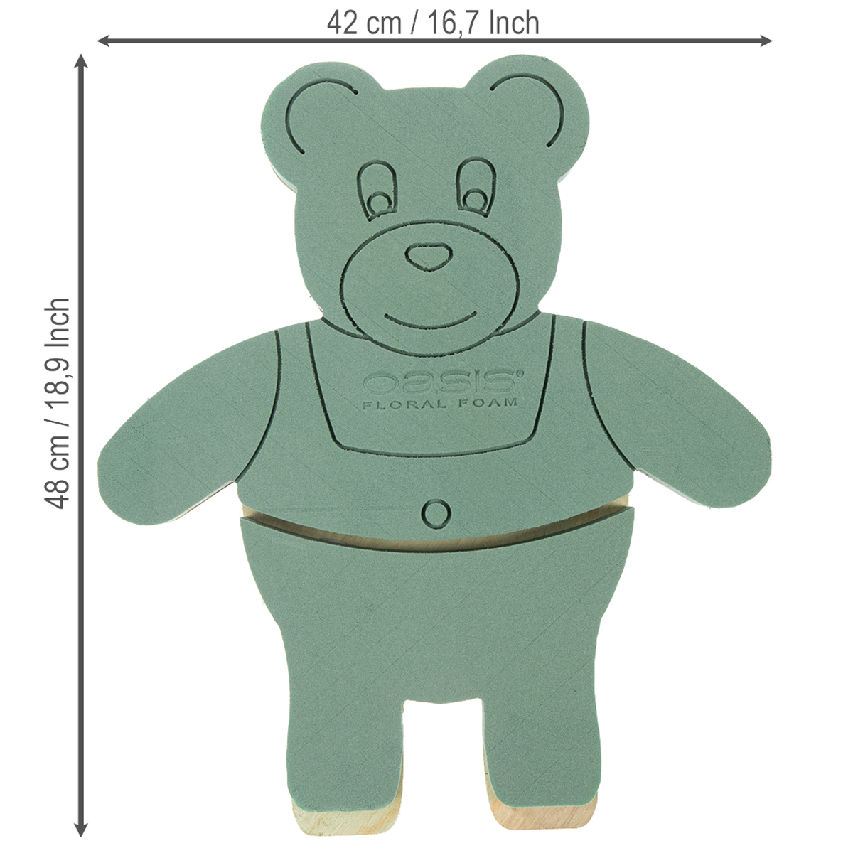 Blomsterskumfiguren Teddy er et originalt og pent underlag. Bjørnefiguren er laget av grønt plug-in materiale og er festet til en trebunn med stativ. Stativet kan enkelt åpnes og lukkes for transport. I tillegg har plug-in-materialet skjærelinjer og er delt inn i segmenter som munn, nese, ører og klær. Skjærelinjene beskytter mot uttørking, ettersom vannet samler seg foran fordypningene.
