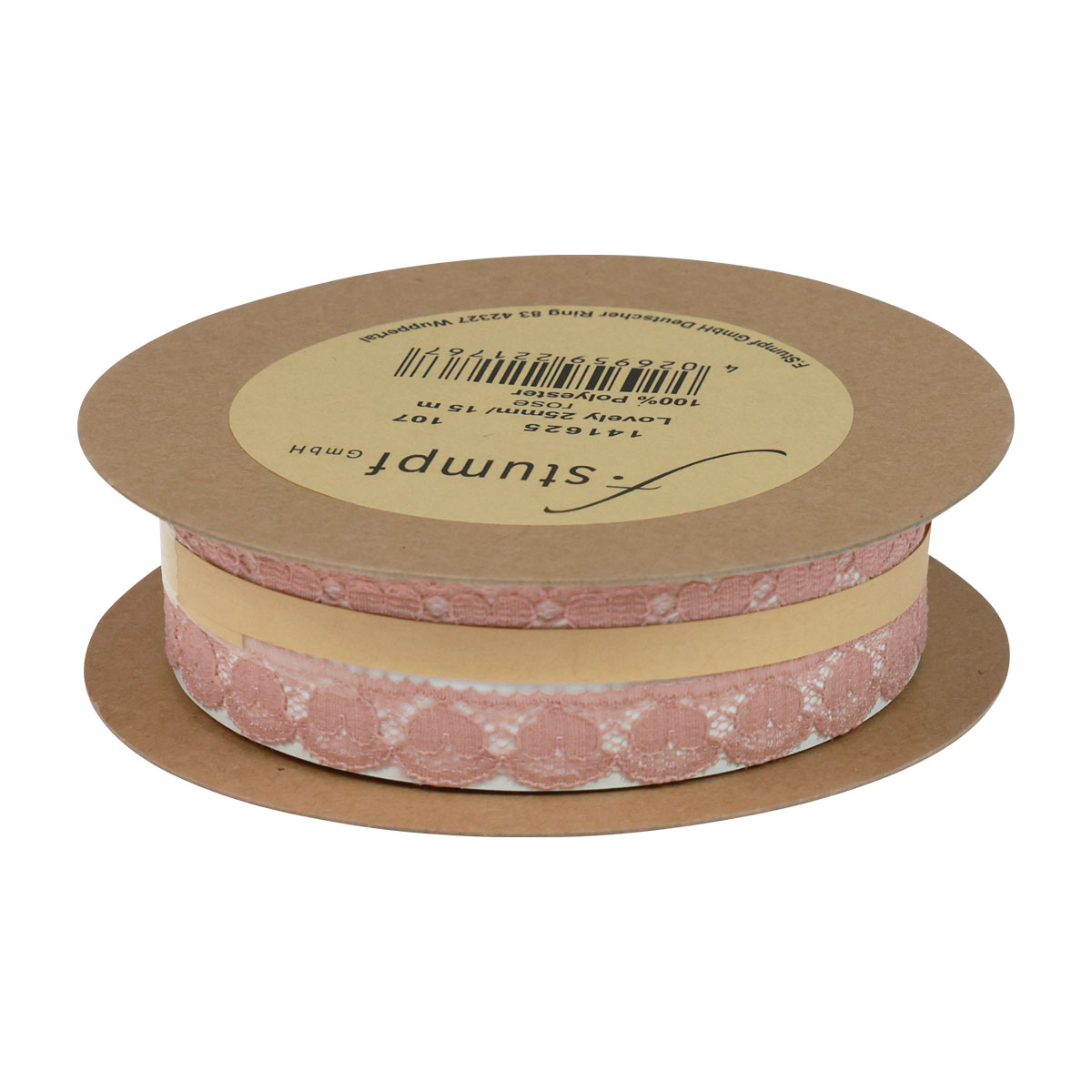 Blondebåndet med hjerter i gammelrosa kommer på en miljøvennlig papprull. For enda mer hjerte kan du også kombinere pyntebåndet med blondebåndene i krem eller hvitt, som har samme mønster.