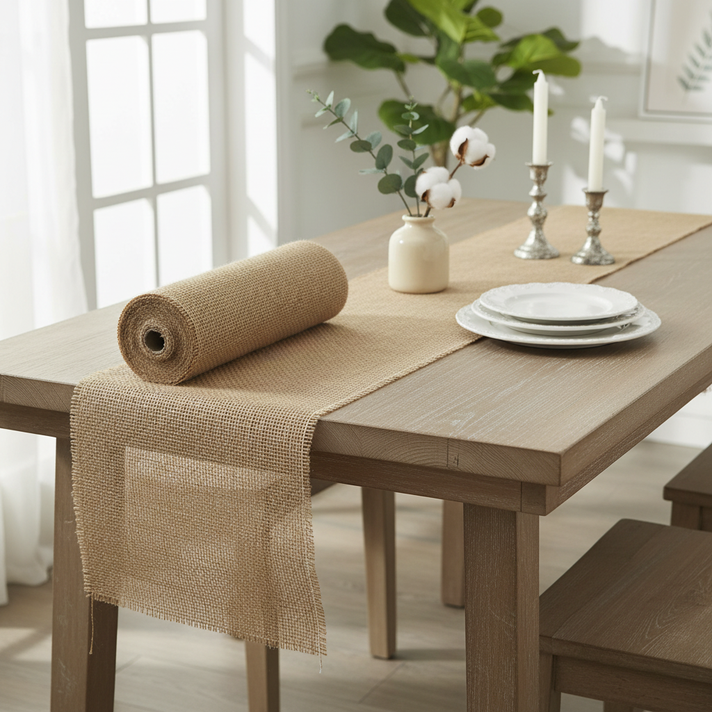 Det naturlige jutebåndet som bordløper er viklet inn i en rull og kan lett rulles opp. Jutebåndet har en lengde på ca 10 meter og en bredde på ca 30 centimeter.