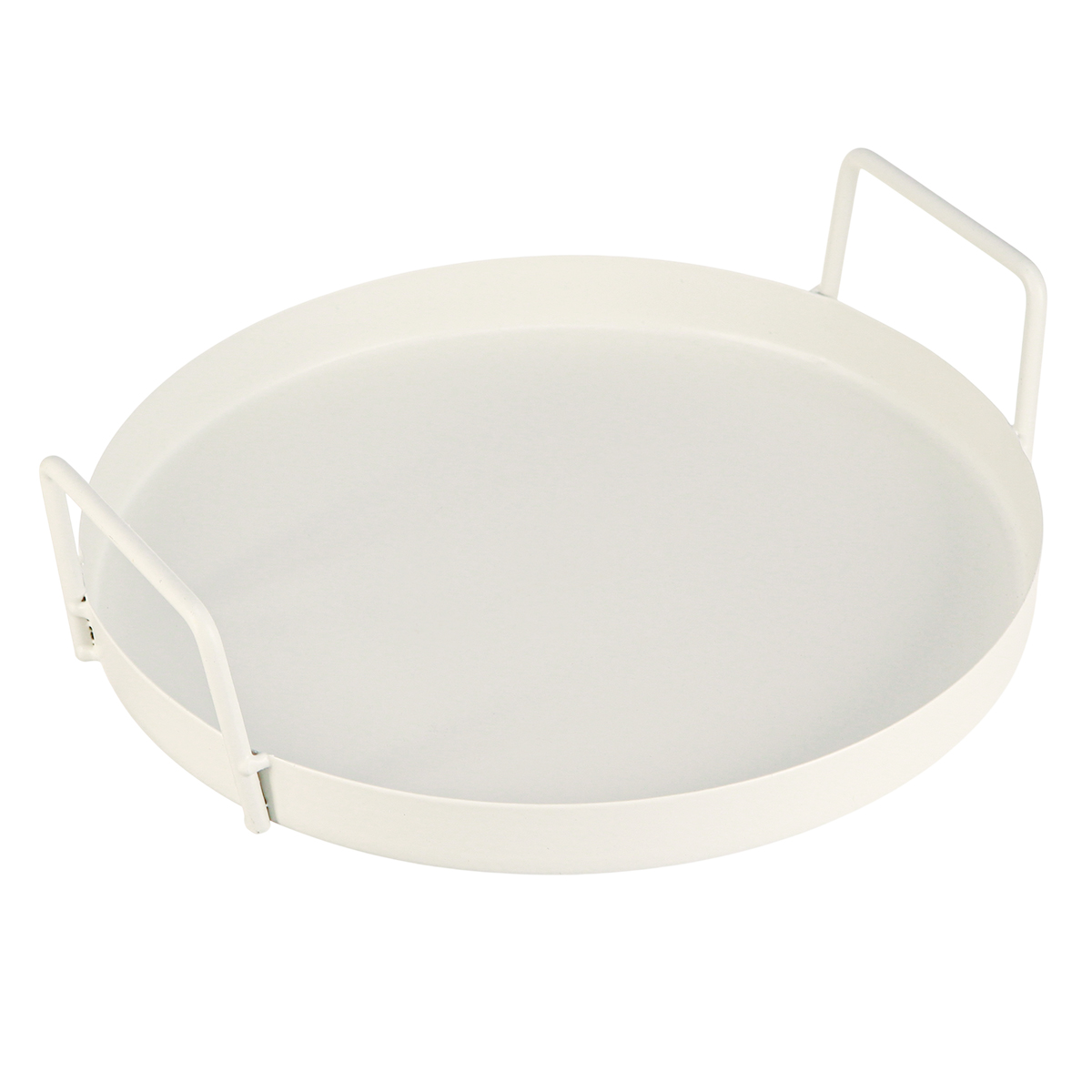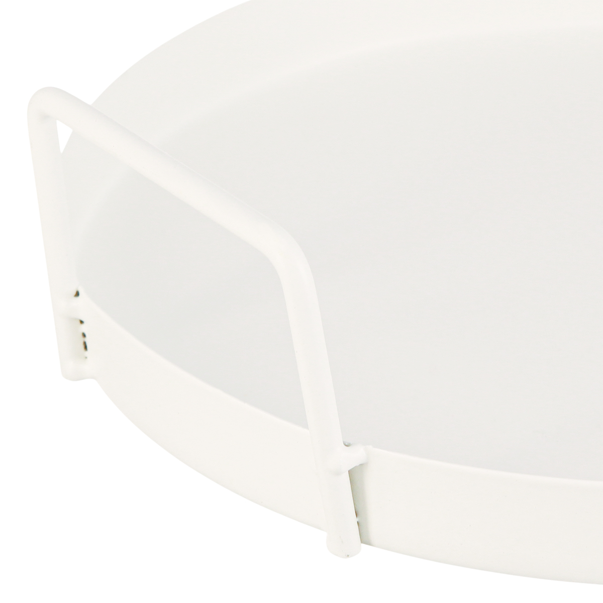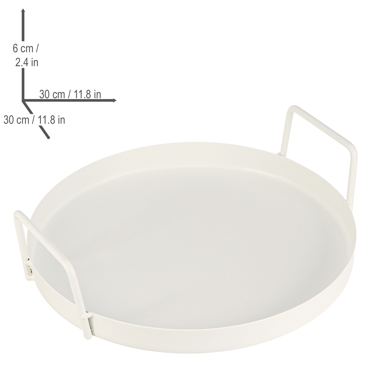 Med en diameter på 30 cm og en høyde på 3 cm tilbyr dette hvite, runde brettet god plass til å presentere drikke, snacks eller dekorative oppsatser på en sikker måte. De høye, solide håndtakene gjør bæring enkel og servering til en lek – enten det er til en hagemiddag eller den neste bursdagsfesten. Den litt hevede kanten forhindrer også at glass eller tallerkener sklir. Rett og slett smart! Det glatte, hvite metallet kan ikke bare skryte av diskré eleganse, men er også usedvanlig enkelt å rengjøre. En fuktig klut er alt som trengs for å gjenopprette brettet til sin tidligere prakt. Kombiner serveringsbrettet med delikate stearinlys, rustikke tredekorelementer eller friske blomster: den nøytrale fargen lar kreativiteten din løpe løpsk. Det ser spesielt slående ut når det kombineres med annet hvitt tilbehør eller i kontrast til mørkere møbler. Enten det er til hjemmebruk eller profesjonell bruk, er dette brettet en ekte allrounder. Du kan bruke det som et kjøkkenbrett for å organisere krydder eller kjøkkenutstyr, eller som et stilig dekorativt element. Det er til og med perfekt som base for små gjør-det-selv-prosjekter. Alle som setter pris på minimalisme vil bli begeistret: funksjonalitet møter rent design!