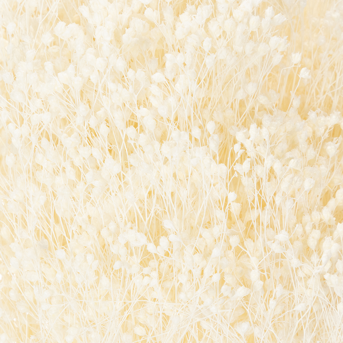 Tørket gyvelblomst ligner babypust. Begge tørkede blomstene er utrolig allsidige. De delikate stilkene til gyvelblomsten forgrener seg utallige ganger, noe som gir denne buketten sitt buskete utseende. Dessuten er gyvelblomsten fengslende med sine mange perlelignende blomster.