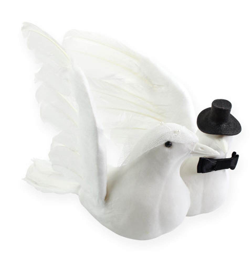 Det hvite fugleparet er omtrent 32 centimeter bredt og omtrent 15 centimeter dypt med en høyde på omtrent 17 centimeter. Ikke bare lage en elegant borddekorasjon med de søte duene; dekorere også bryllupsbilen eller vognen til brudeparet. Bryllupsduene er også en fin suvenir fra bryllupsseremonien: det nygifte paret kan ta med deg duefiguren for å dekorere og enkelt presentere den på en hylle eller i et utstillingsvindu.