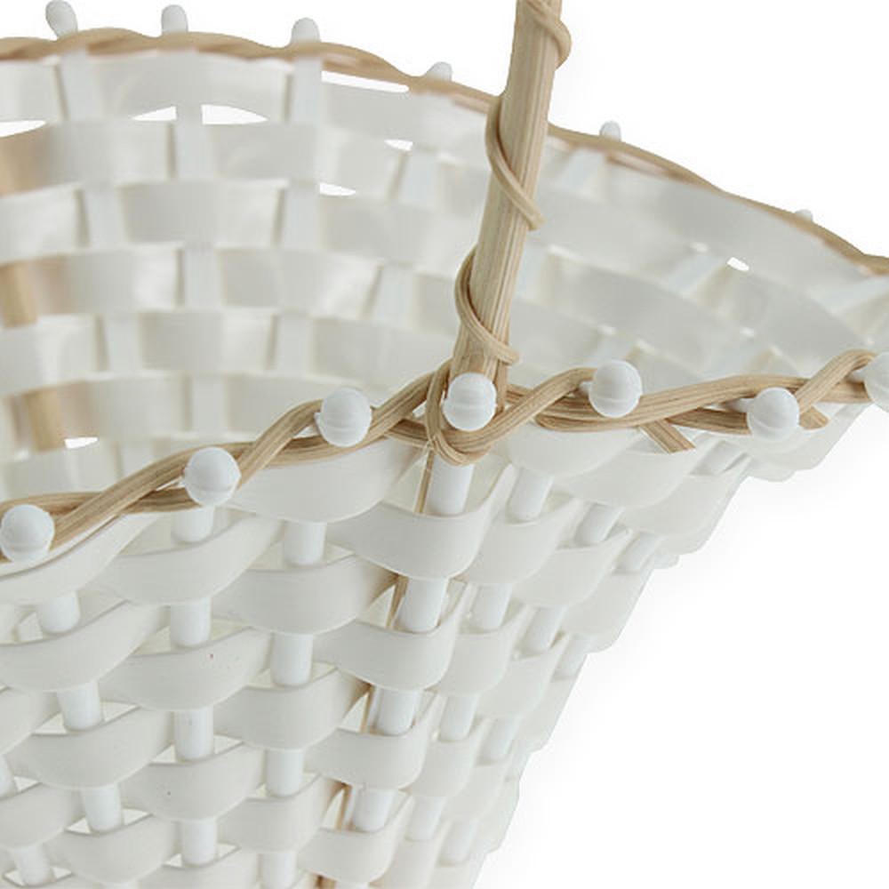 - Materiale: Hvit plast, flettet rottingkant og håndtak