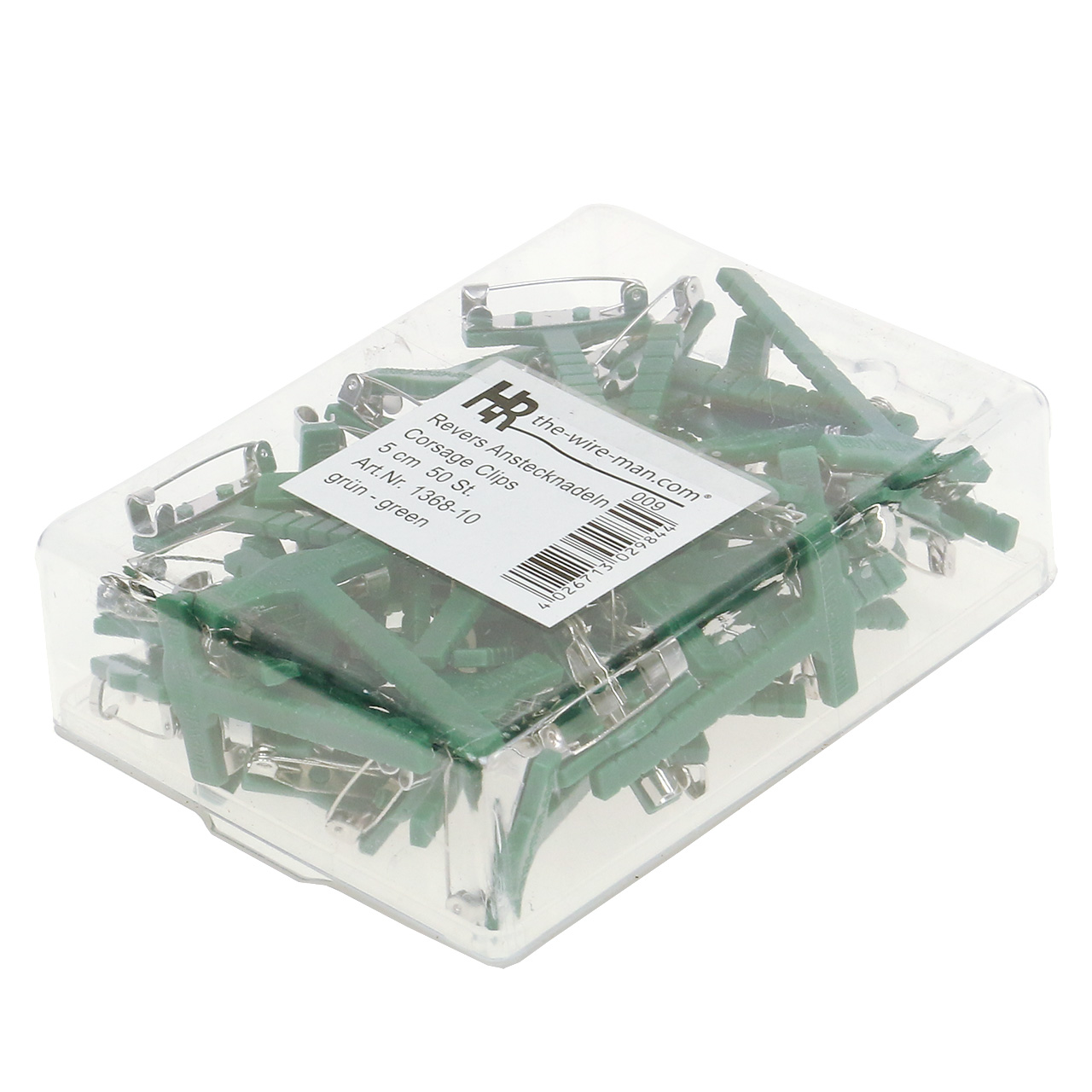 Bryllupsnålene i grønt og sølv fås i et sett på 50 i en hendig, liten eske laget av plast. Hver kontakt måler ca. 2,6 x 5 tommer.
