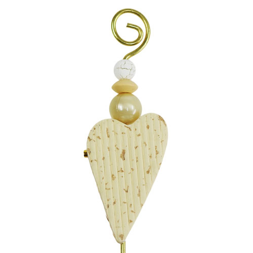 Bryllupsnålen med hjerte i kremfarge er i en pose med totalt 16 stykker og er også pakket separat. Merket er omtrent 12 centimeter langt og består i utgangspunktet av en gullbelagt metallstang, som er blitt omgjort til en liten snegle øverst og en stor snegle nederst.