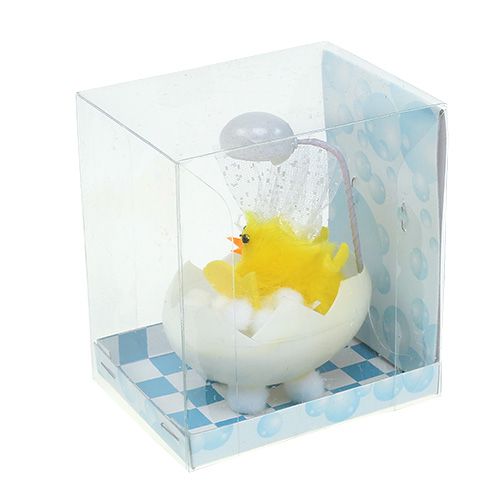 Den gule chenille-kyllingen på badet er rundt 8,5 centimeter høy med pappstativet, og i tillegg til badekaret, der det skum av hvite bomullsballer flyter, er det også et dusjhode, hvorfra vann, representert her med organza-stoff , kommer ut. Fisken, de gule vingene og det oransje nebbet er laget av filt og avrunder det herlige bildet av den badende påskekyllingen med de svarte øynene.