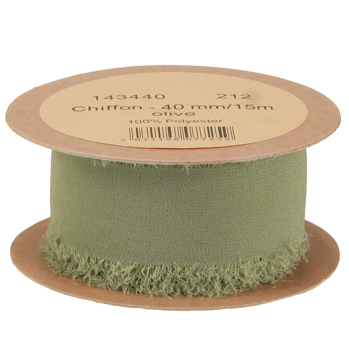 Opplev høy kvalitet med vårt chiffonbånd i elegant olivengrønn. Med en bredde på 40 millimeter og en lengde på 15 meter er dette stoffbåndet ideelt for allsidige dekorasjoner og kreativt arbeid. Båndet med de delikate frynsene sørger for en naturlig og stilig stil overalt.