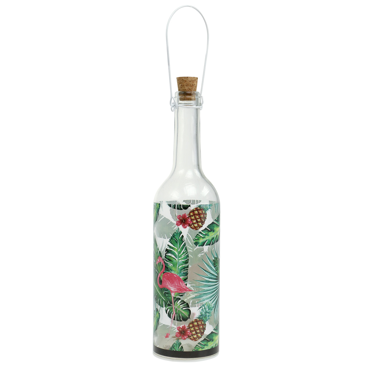 Den dekorative flasken med lysdioder i varmhvit og et flamingomotiv leveres som et sett med 2. Med håndtaket har hver lampe en total høyde på omtrent 37,5 centimeter, med selve flasken omtrent 28,5 centimeter høy og omtrent 7,3 centimeter i diameter.