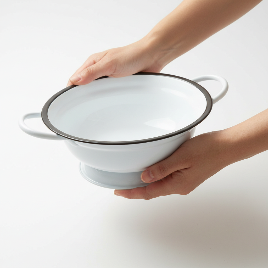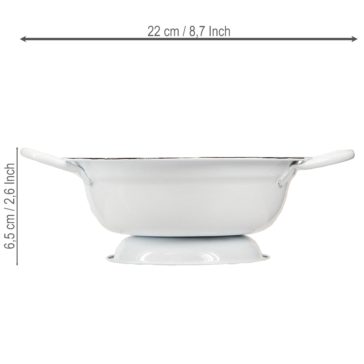 - Materiale: Metall i hvit emaljelook med svart kant