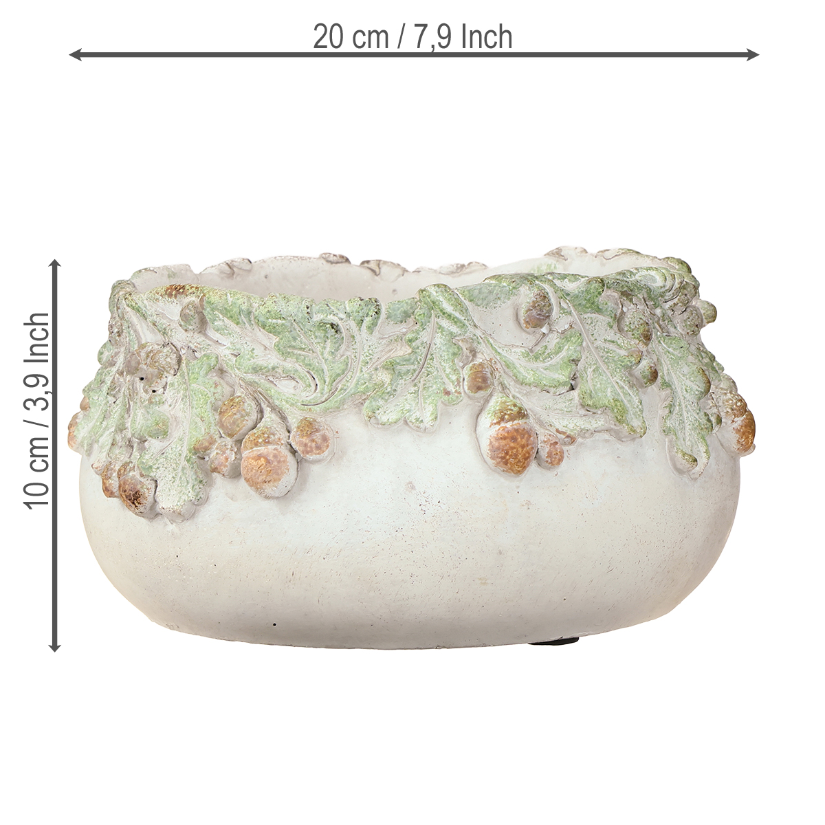 Leter du etter det spesielle til leiligheten eller hagen din? Vår dekorative skål i støpt stein gir ikke bare hjemmet ditt et hint av rustikk sjarm, den gir også et snev av rustikk sjarm. Enten den er i stuen, som en storslått dekorasjon på terrassen eller som høydepunktet på hagefesten – denne skålen gjør seg alltid godt! Laget av robust støpt stein lover den holdbarhet og klasse. Dekorert med malte eikenøtter og eikeblader tiltrekker den seg alles oppmerksomhet. Tenk deg hvordan den vil bli samtaleemnet på din neste invitasjon. Men vær forsiktig, skålen er kanskje ikke helt vanntett! Et lite tips: Plant aldri uten plastfolie. Valget er ditt: Bruk den som en sjarmerende potte til grønne detaljer, eller la kreativiteten løpe løpsk når du arrangerer blomsterdekorasjoner.