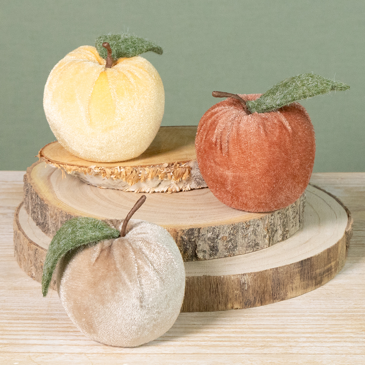 Dette dekorative fløyelseplet med et filtblad passer perfekt inn i høstdekorasjonen din. Uttrykk kreativiteten din med disse stilige fløyelseplene, nøye laget i tre varme høstfarger: rødbrun, beige og gul. Hvert kunstige fløyelseple er omhyggelig laget og laget av belagt isopor dekket av et mykt stoff. Det fløyelsmyke skimret og det grønne filtbladet, kombinert med en liten brun stilk, fullfører det detaljerte utseendet og gir et utsøkt tillegg til stuedekorasjonen eller høstlige borddekorasjoner. Enten som en del av en elegant hylle, blant sesongbaserte festdekorasjoner eller for kreative fotobakgrunner, gjør disse eplenes allsidighet dem til et høydepunkt i innredningen din.