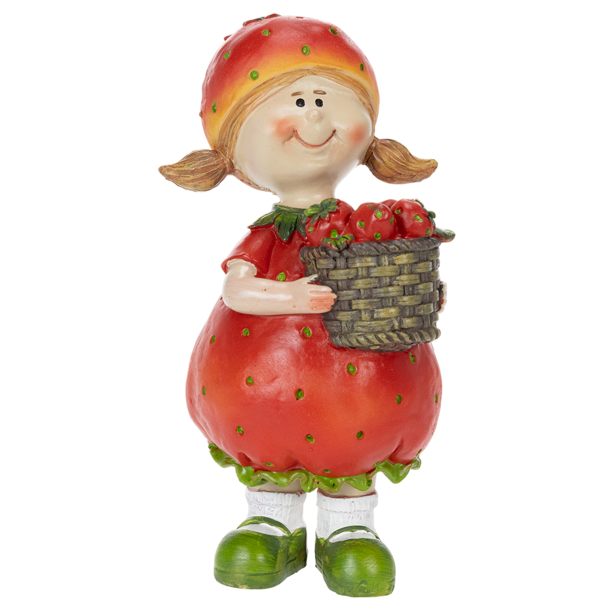Jordbærjenta er 18 centimeter høy og har intrikate detaljer, og er en dekorativ figur som gir et snev av eventyrlig magi til ethvert rom. Figuren, i livlig rødt og grønt, er perfekt for å forbedre balkongens blomsterhjørner, stuehyller eller sommerfestbord. Den søte jordbærkjolen, det søte flettede håret og kurven som flyter over av jordbær skaper et harmonisk helhetsinntrykk.
