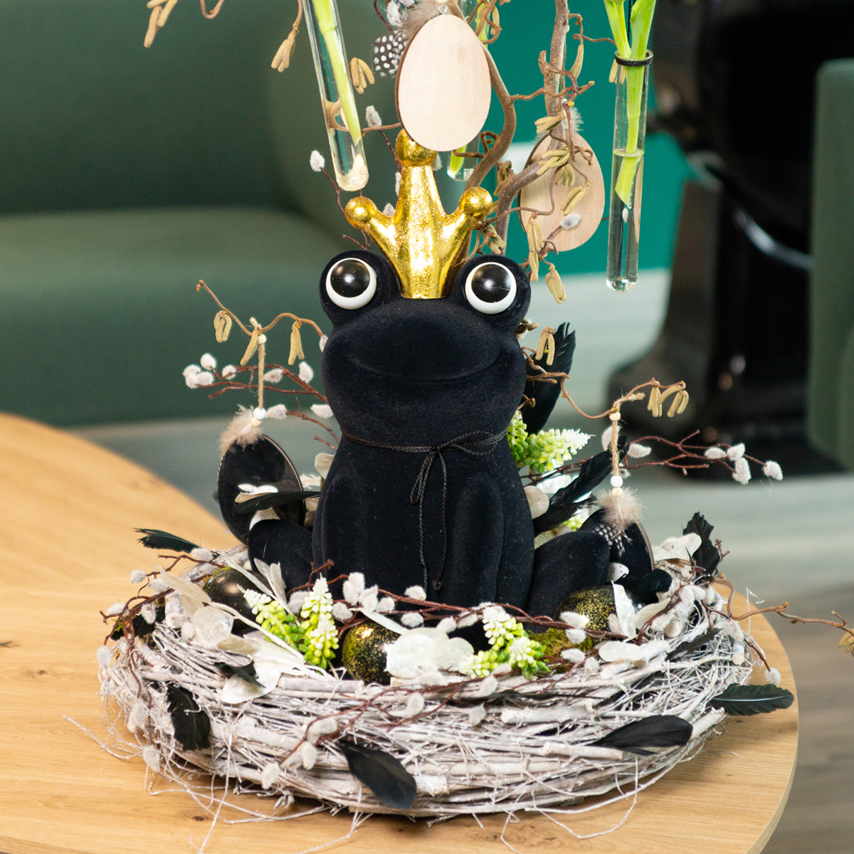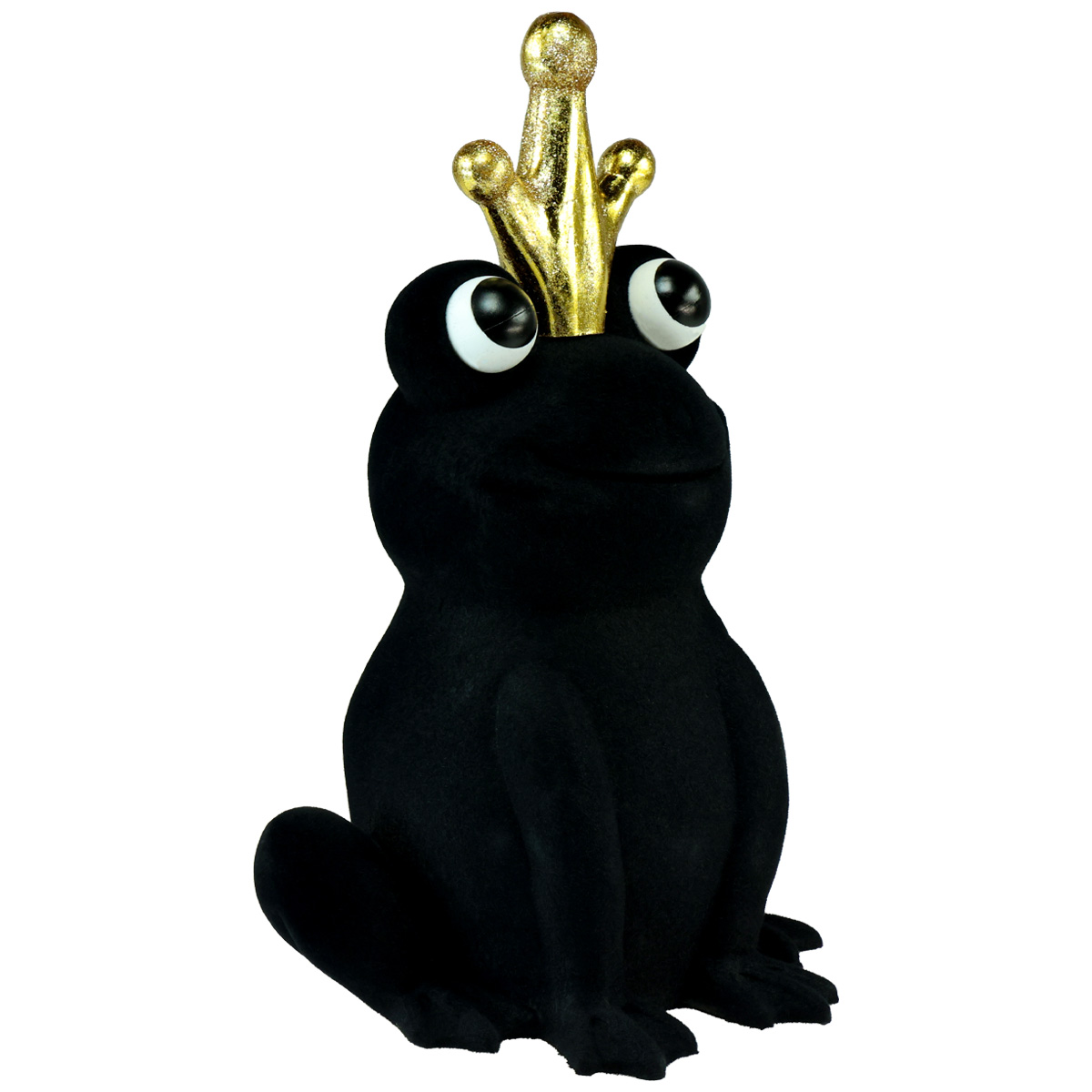 Dekorativ frosk, froskeprins, vårdekorasjon, frosk med gullkrone svart 40,5cm