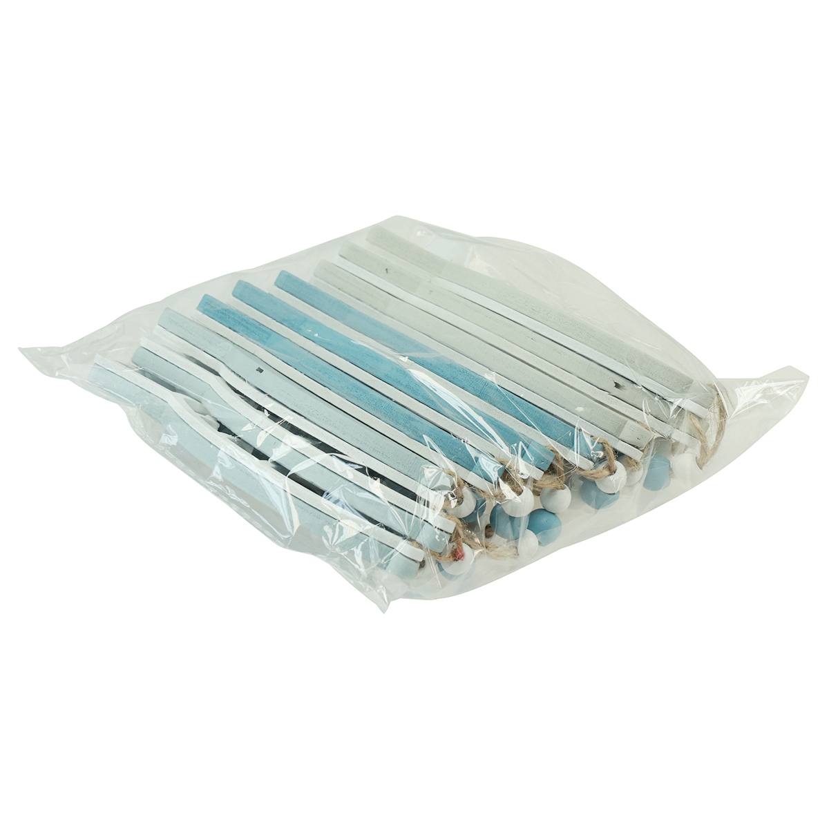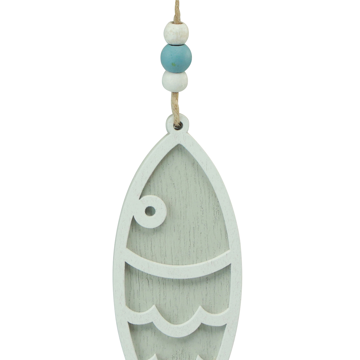 Til oppheng har pyntefiskene en henger i naturfarger, som er dekorert med hvite og blå treperler.