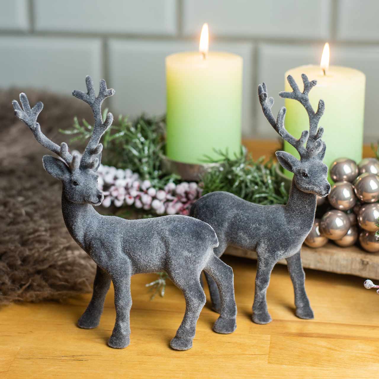 Du får to av de grå hjortene i et assortert sett: De to reinsdyrene er forskjellige i stilling, gevir og til og med i ansiktsuttrykk! Dekorasjonstallet er omtrent 20 centimeter høyt med en lengde på omtrent 15 centimeter.