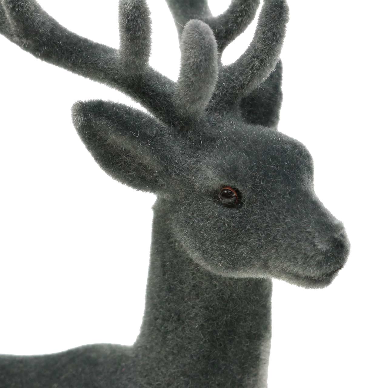 Den flokkede dekorative hjorten i grå fortryller i julepynten med naturlig nåde og myk glans.