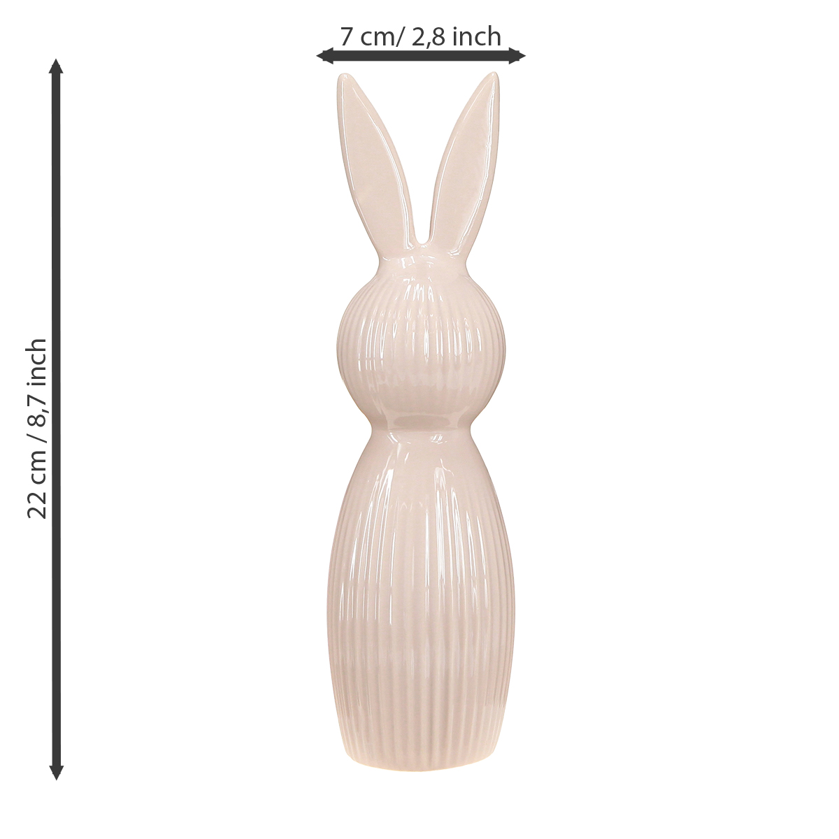 Et dekorativt objekt som kombinerer stil og sjarm: Denne keramiske kaninen er 22 cm høy og fengsler med sin slanke silhuett og delikate rosa fargetone. De fine, vertikale sporene gir den en elegant tekstur og et lekent preg av bevegelse til designet. Med en diameter på 7 cm er den plassbesparende og passer perfekt selv på smale vinduskarmer eller hyller. Det høykvalitets keramiske materialet imponerer med sin soliditet og holdbarhet – ideelt for alltid å se best mulig ut, selv i områder med mye trafikk som stuen eller spisestuen.