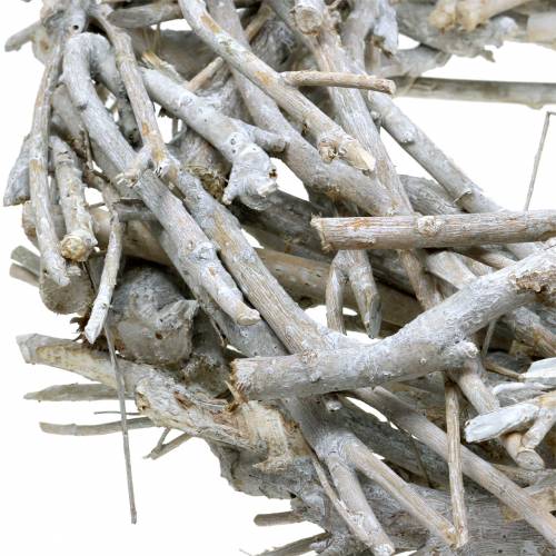 Den dekorative kransen med grener vasket i hvitt har en utvendig diameter på omtrent 50 centimeter og en innvendig diameter på omtrent 25 centimeter, hvorved den er omtrent 15 centimeter høy.
