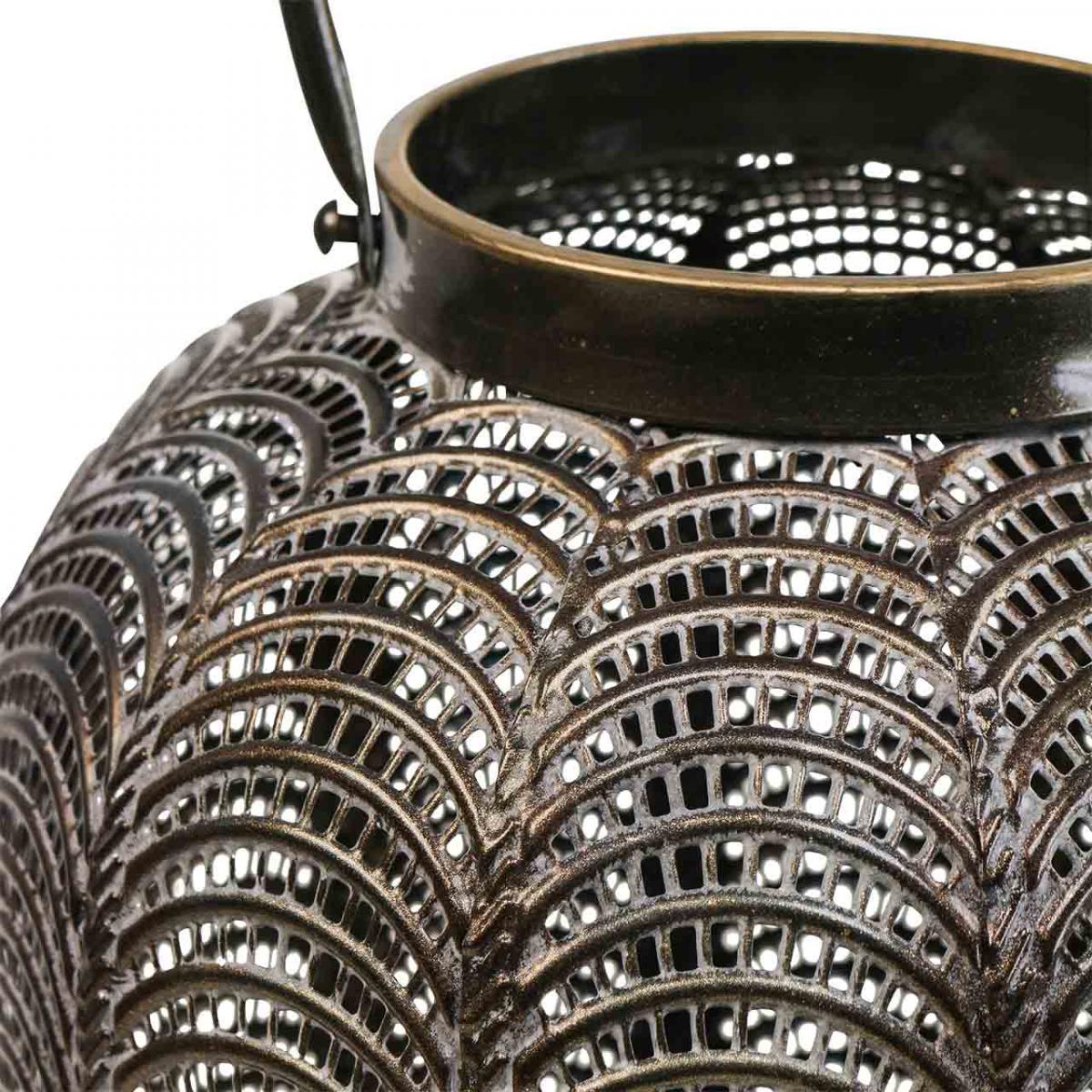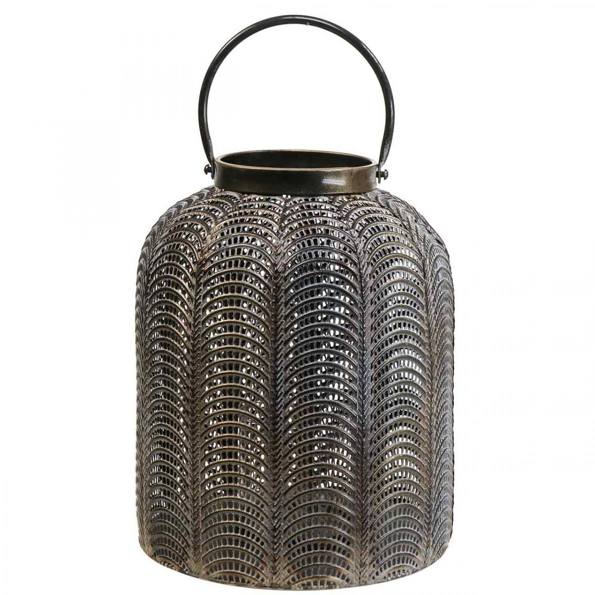 Den nostalgisk utformede, gjennombrutte lykten minner om jugendstil og skimrer i delvis kobberfargede, delvis blågrå oksiderte metalltoner. Subtilt blekede detaljer lyser opp dekorasjonen og gjør at den dekorative lykten skiller seg enda bedre ut.
