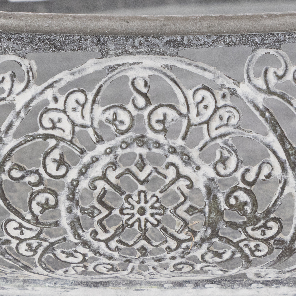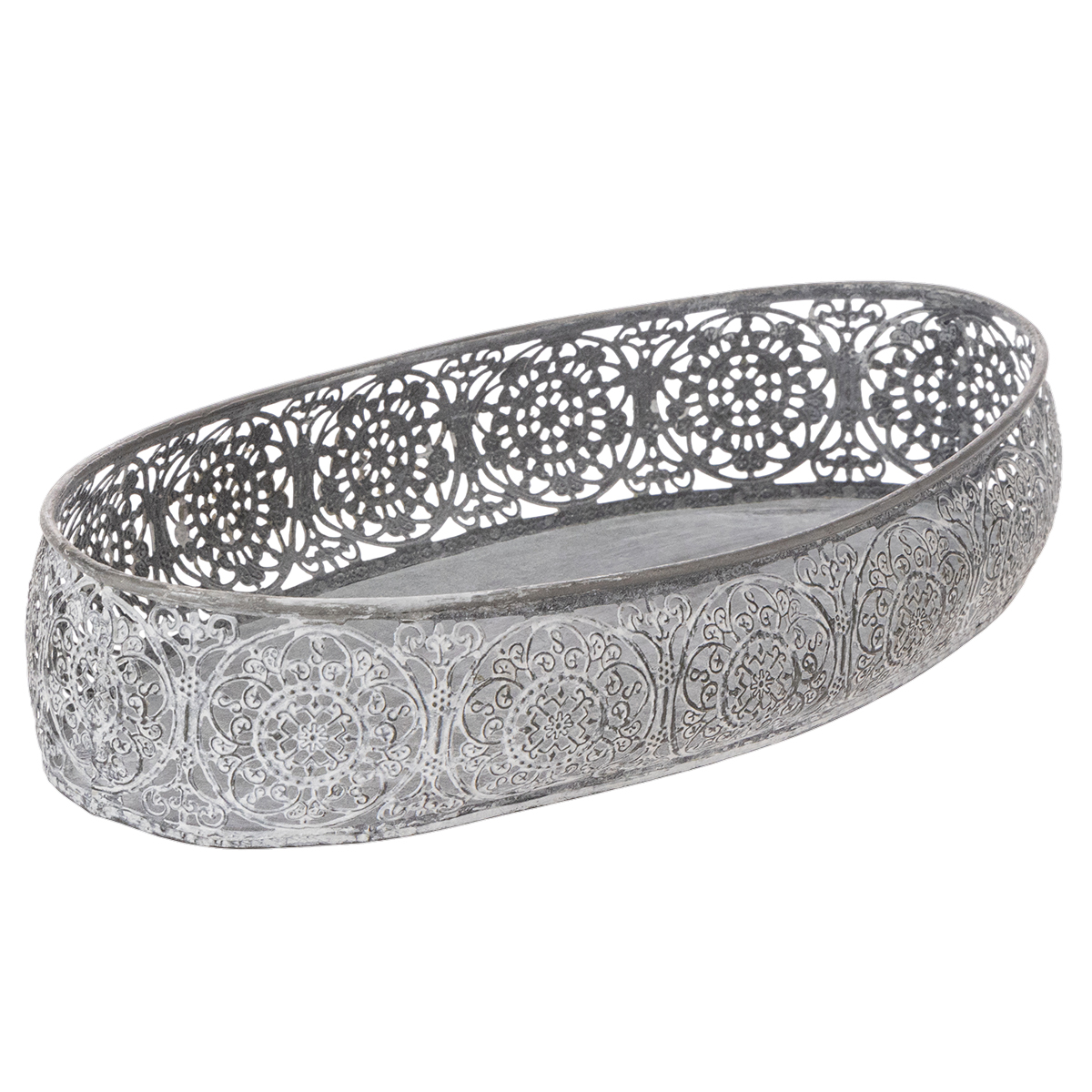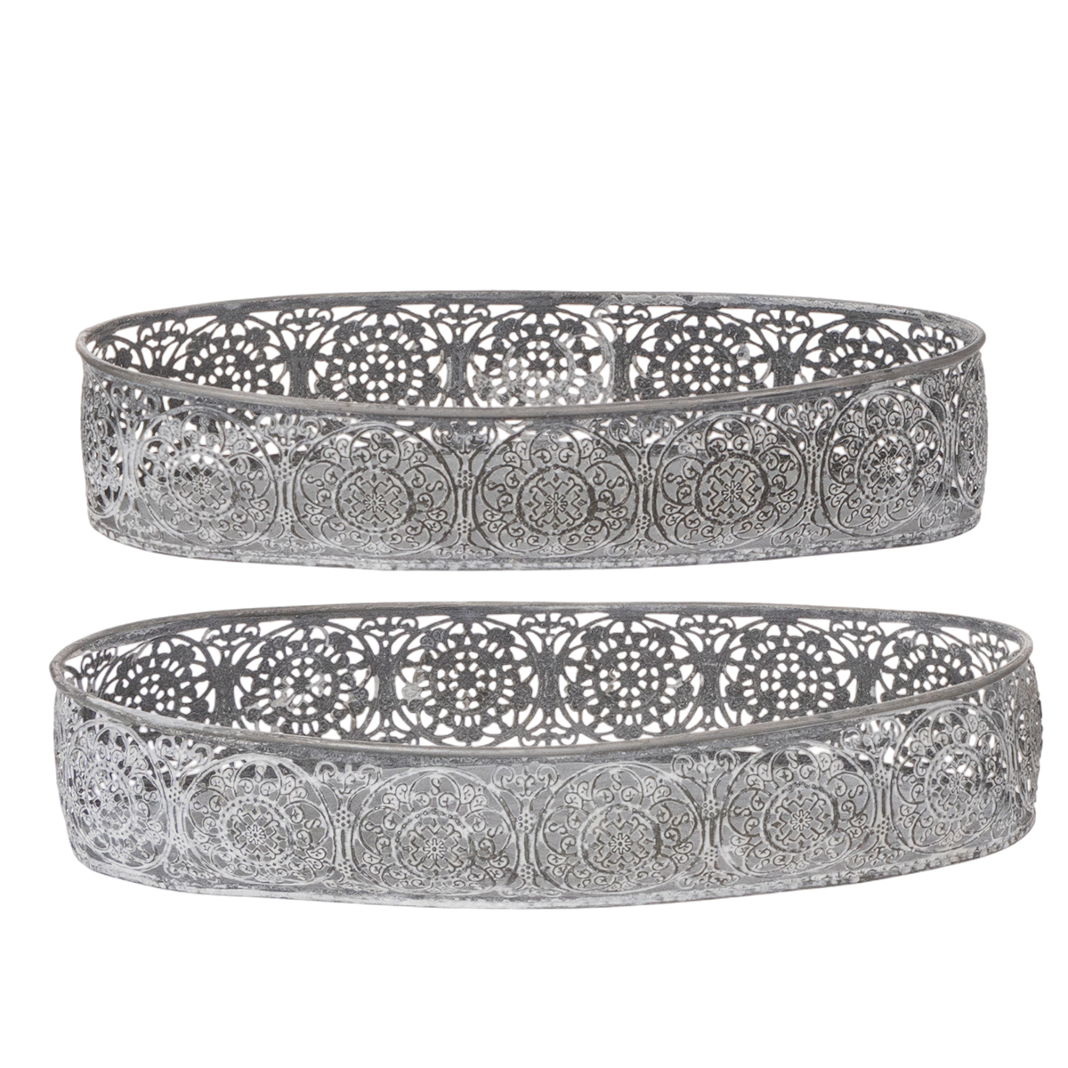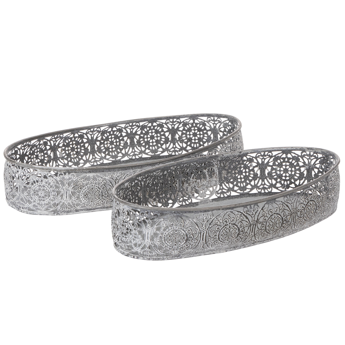 Disse to vakre dekorative skålene laget av metall og med en dekorativ kant vil definitivt finne en plass på kommoden eller skjenken din. Metallskålene matcher filigran-blomstermønsteret, sølvgrå og vasket hvite. Perfekt for en kommode i trendy vintagestil!
