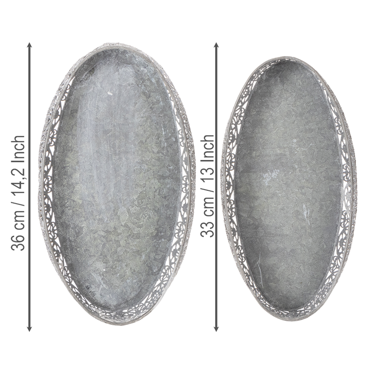 Dekorativ metallskål, grått mønster, oval, L36 cm/33,5 cm, sett med 2