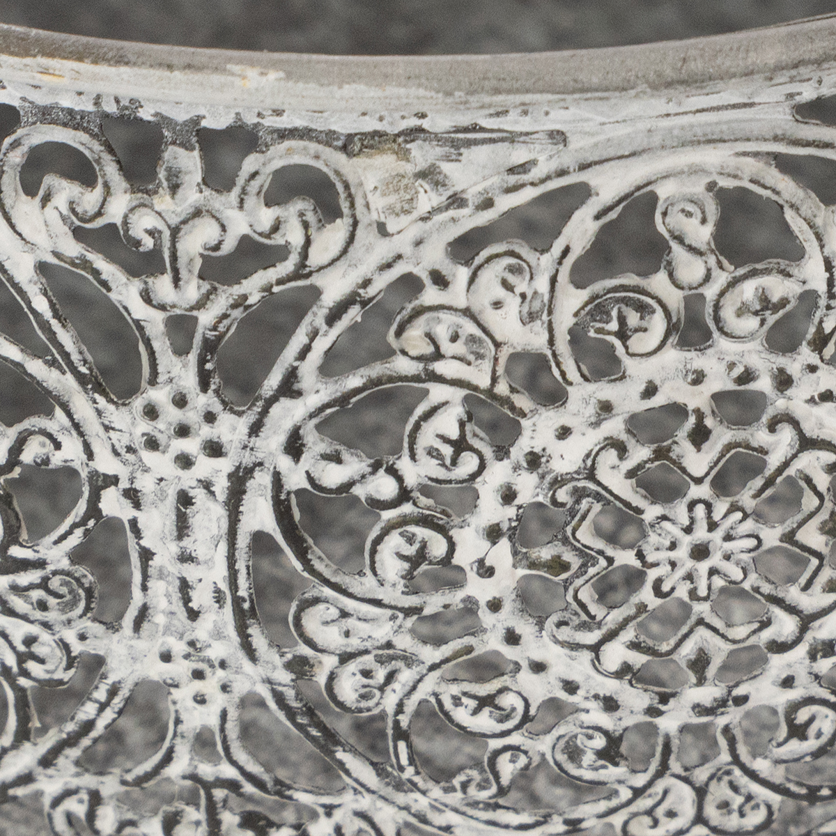 Blomstermønstrene og den tidløse sølvgråen gjør den hvitvaskede dekorative skålen til en fantastisk vintagedekorasjon.